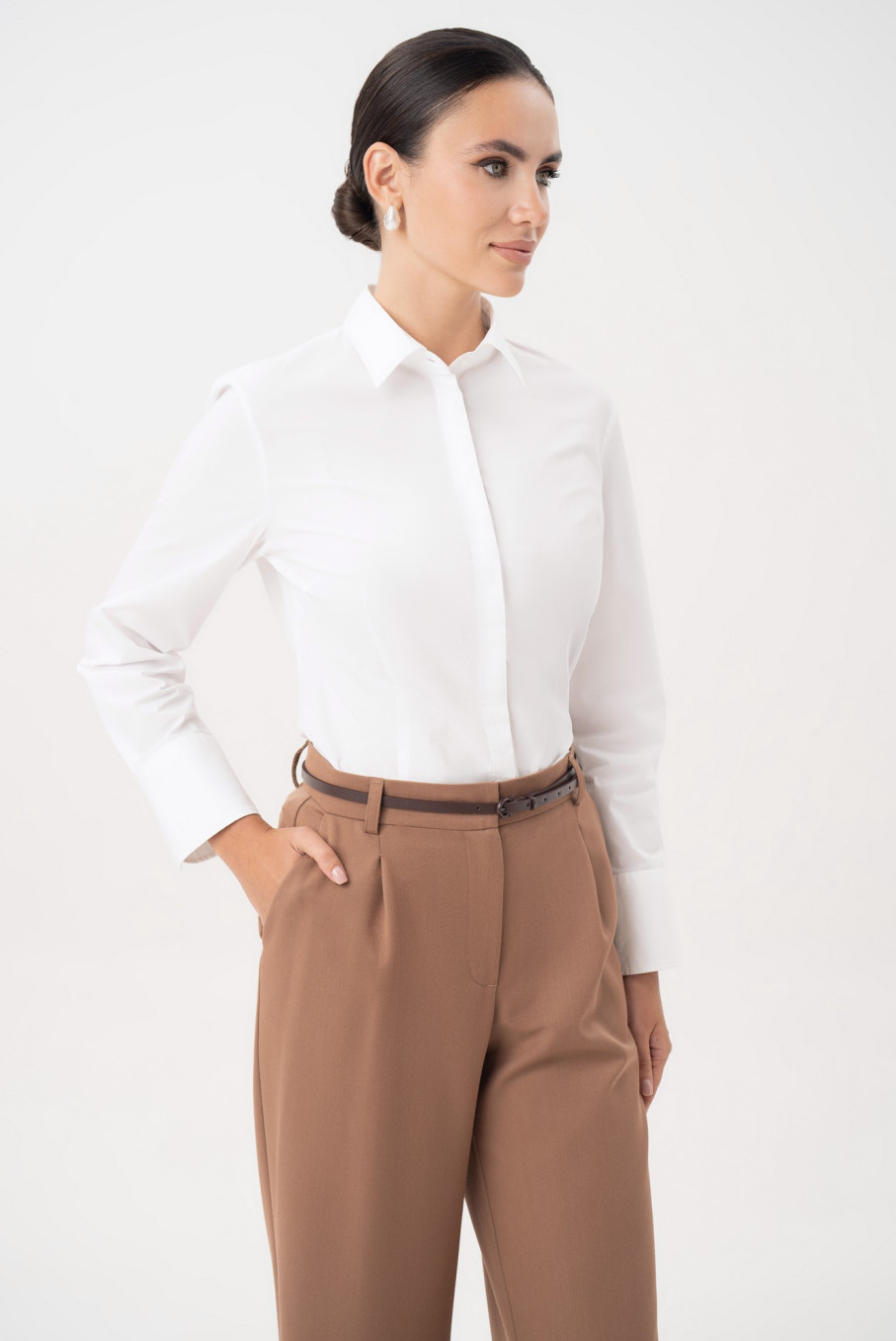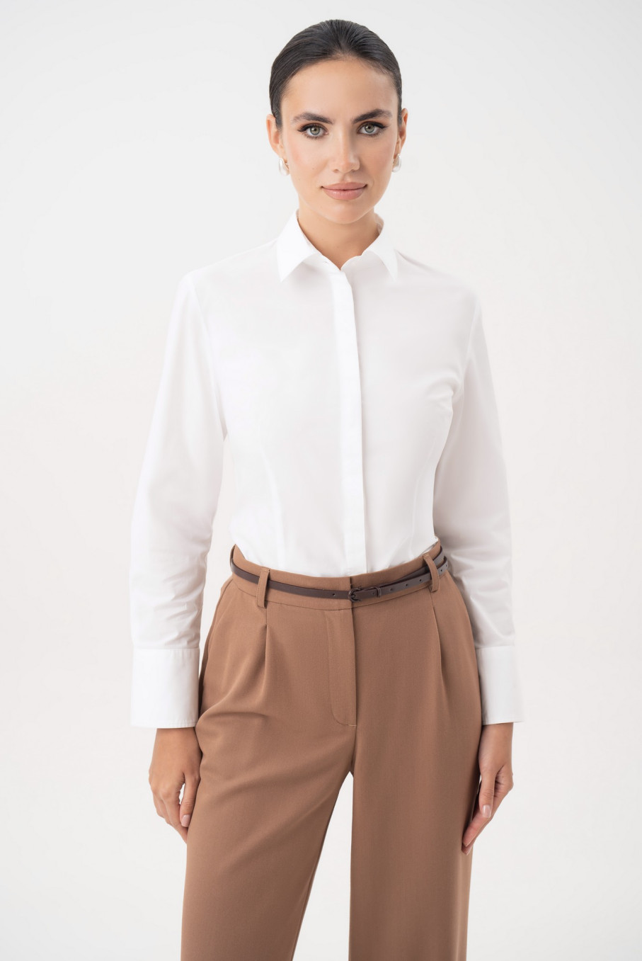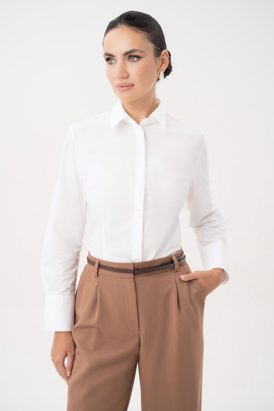 Эта блузка женская белая с длинным рукавом идеально держит форму, не теряет привлекательности даже после целого дня активной работы. Строгий отложной воротник и планка, скрывающая пуговицы, добавляют аккуратности и благородства, а приталенный силуэт подчёркивает достоинства фигуры.
