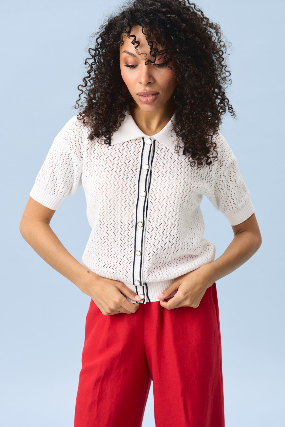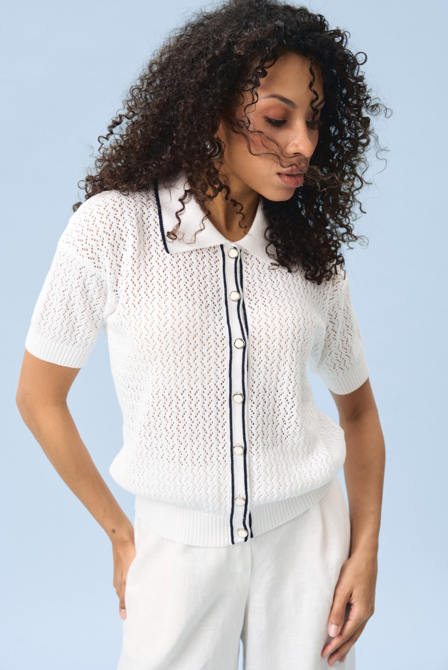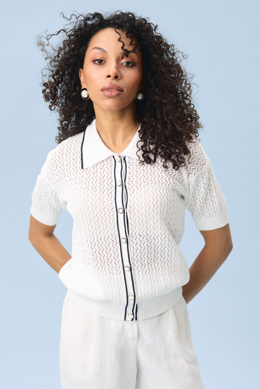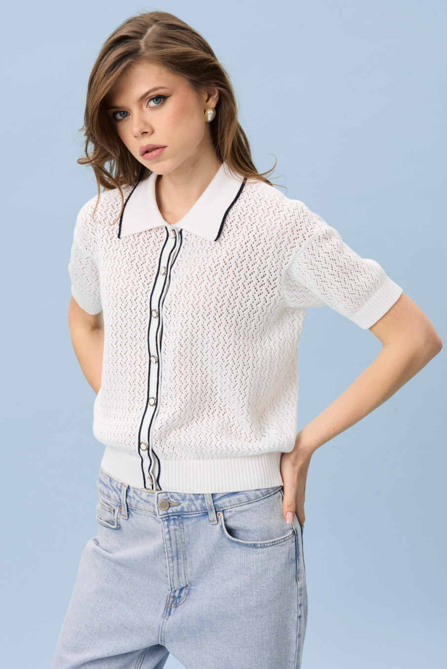 Белый джемпер женский с коротким рукавом URS - это идеальный баланс между элегантностью и комфортом. Ажурная кофта женская в формате поло выглядит легко, современно и подходит как для повседневных образов, так и для более нарядных сочетаний. Этот тонкий джемпер женский гармонично вписывается в базовый гардероб и помогает создавать стильные комплекты без лишних усилий.