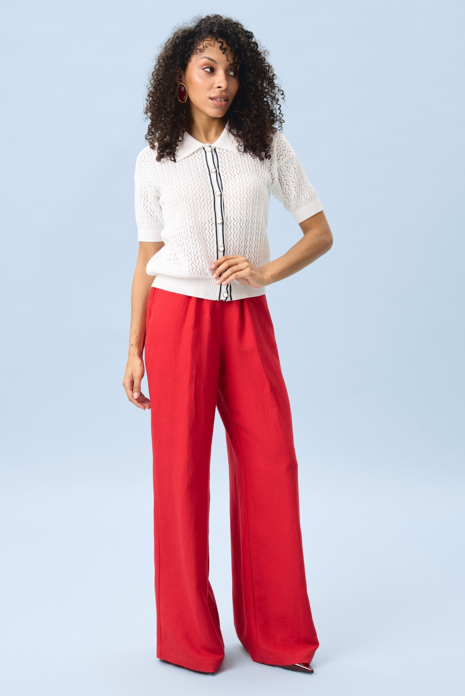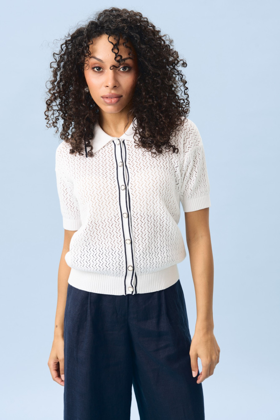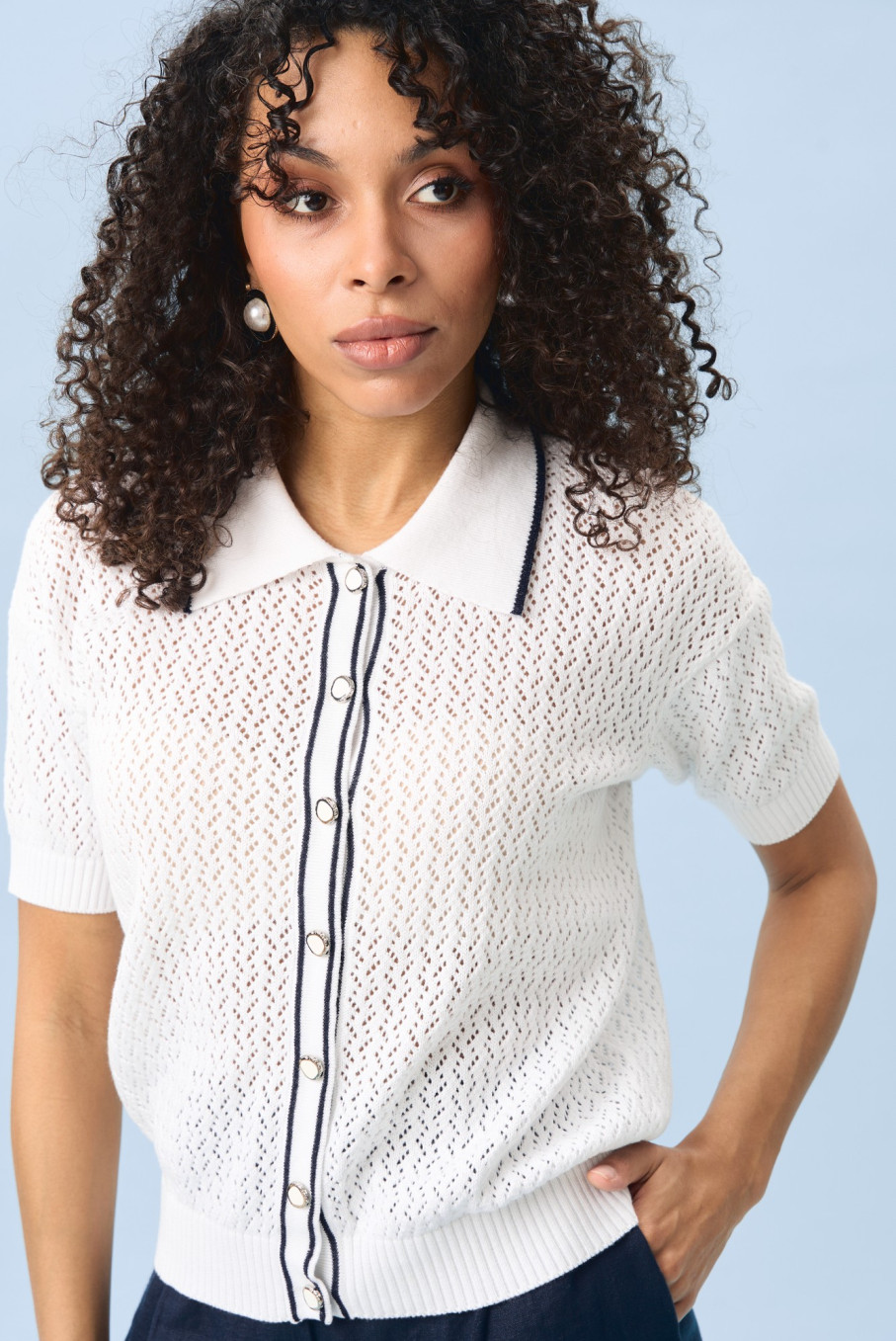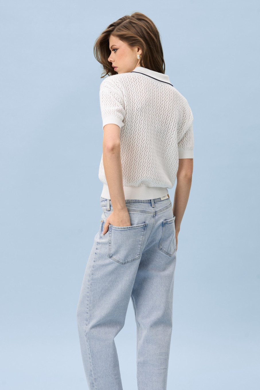 Белый джемпер женский с коротким рукавом URS - это идеальный баланс между элегантностью и комфортом. Ажурная кофта женская в формате поло выглядит легко, современно и подходит как для повседневных образов, так и для более нарядных сочетаний. Этот тонкий джемпер женский гармонично вписывается в базовый гардероб и помогает создавать стильные комплекты без лишних усилий.