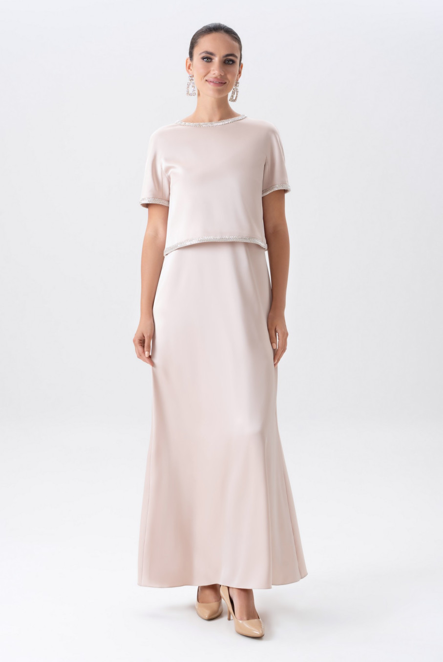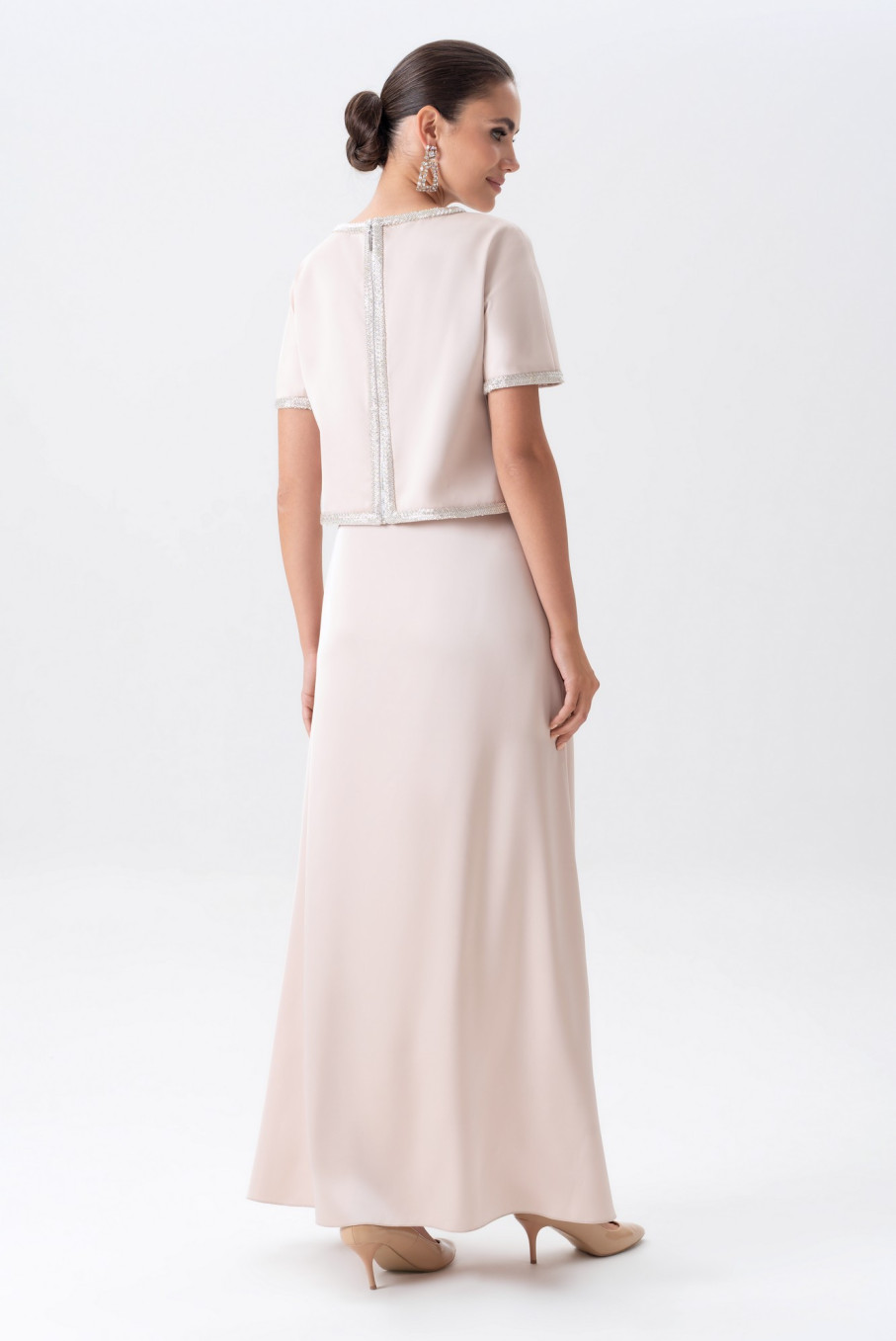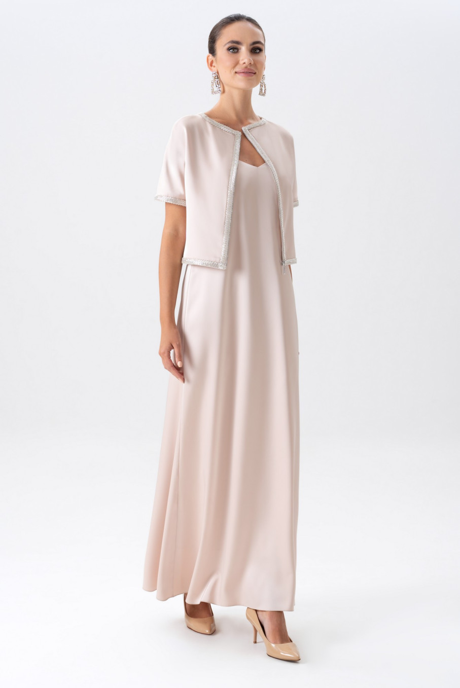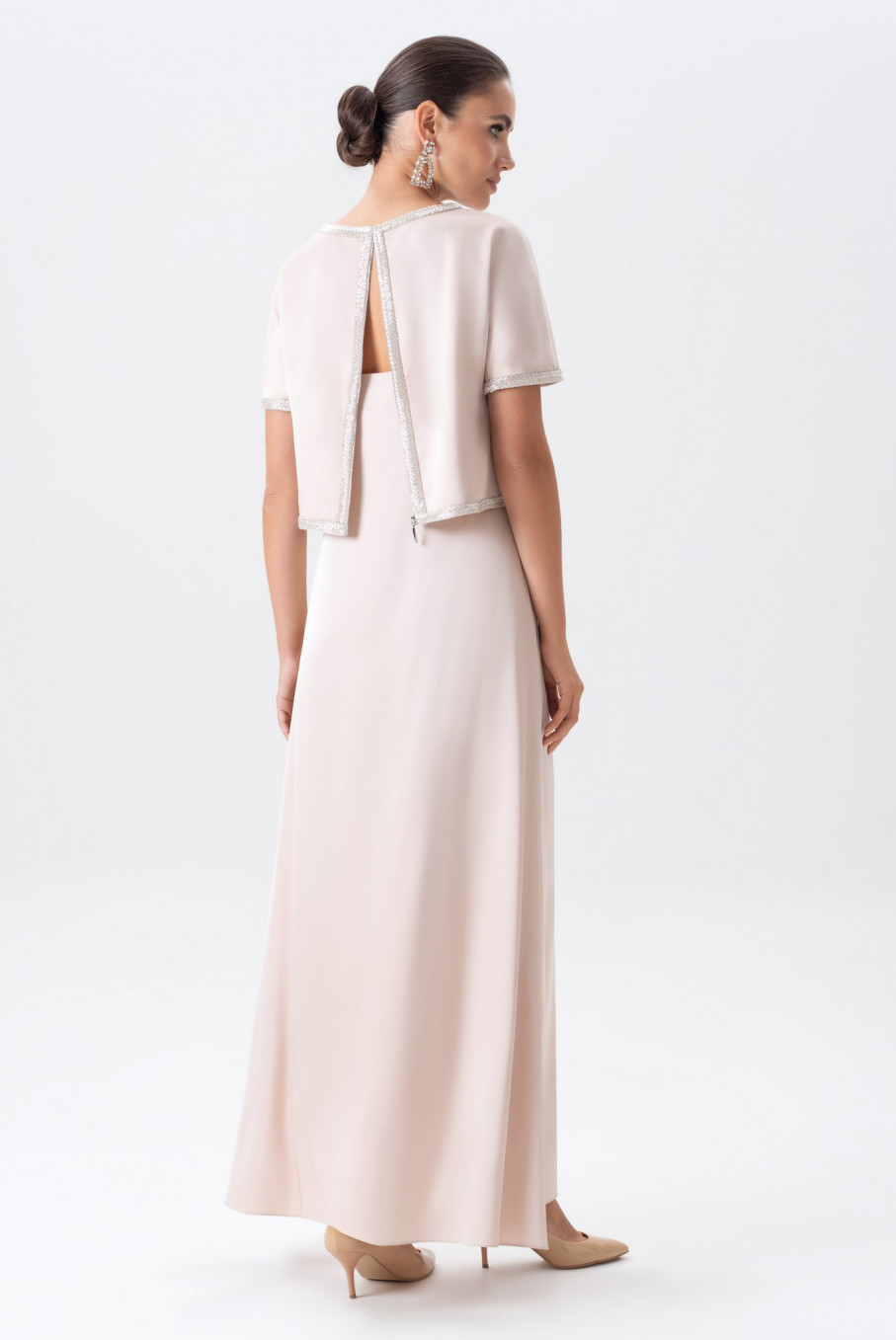 Нежный оттенок, благородная отделка и текучий силуэт делают этот комплект стильным выбором для тех, кто ищет нарядное платье женское на торжество, но хочет получить больше, чем просто платье. Костюм с длинным платьем смотрится особенно выразительно в танце и движении, подчеркивая легкость и утончённость женщины.