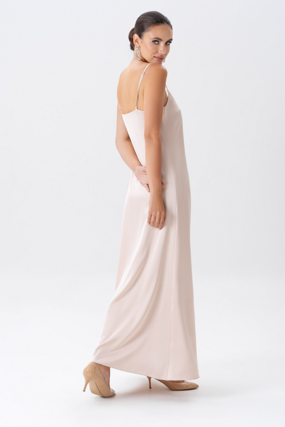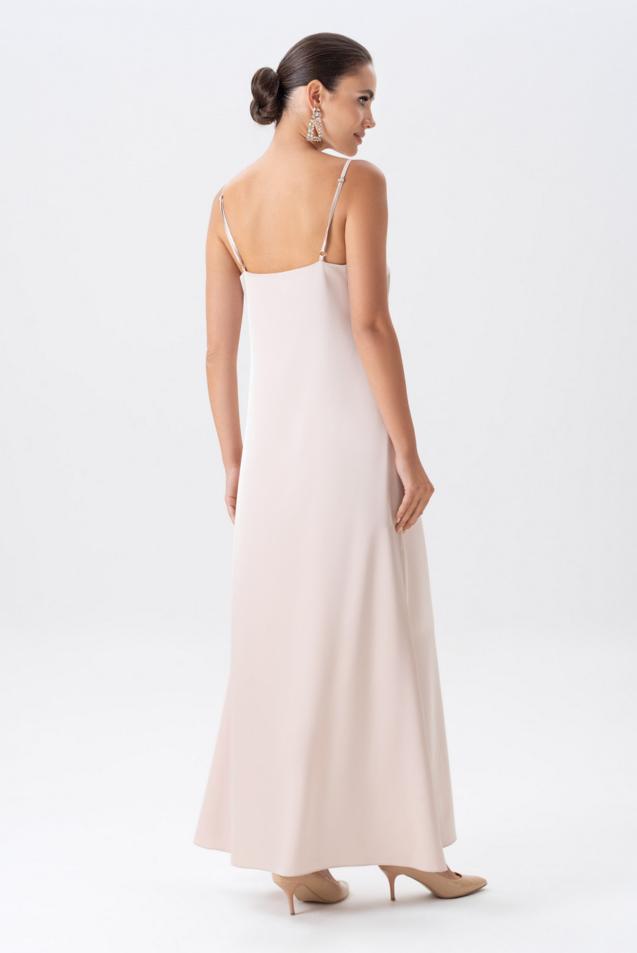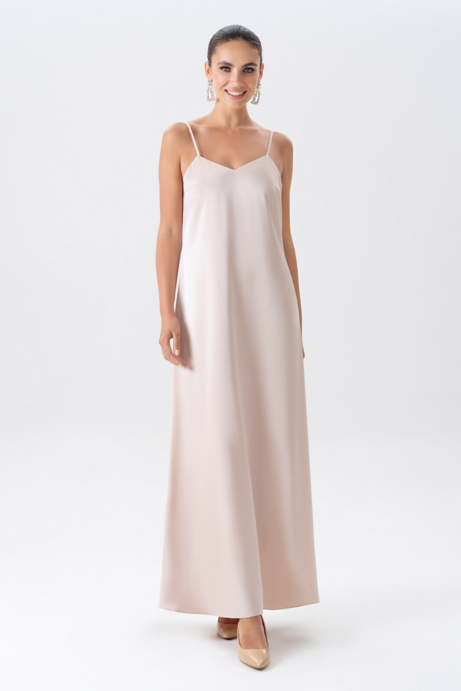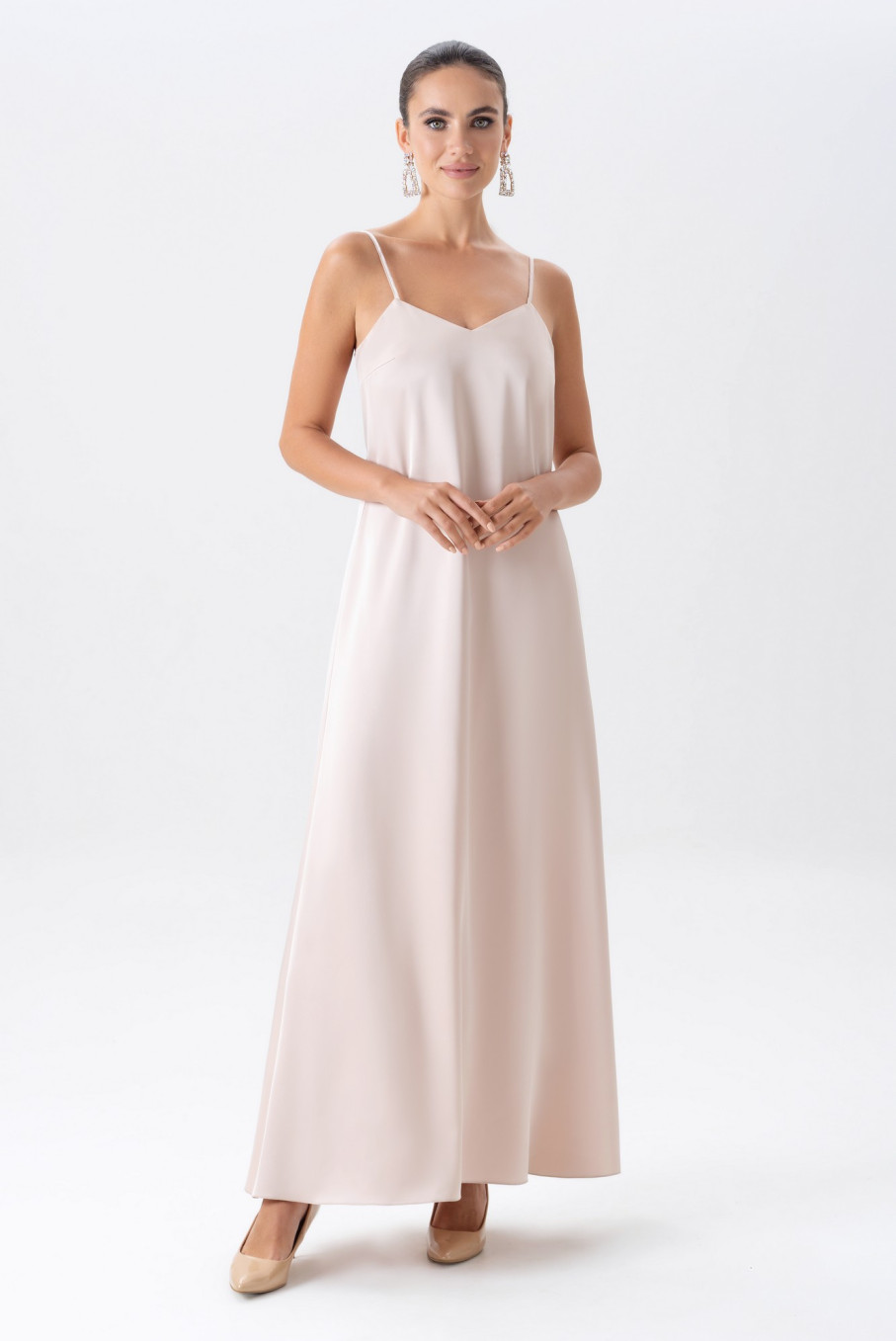 Платье полуприлегающего силуэта, на бретелях, слегка расклешенное к низу, длинное, на отлетной по низу подкладке. Перед с нагрудными вытачками, выходящими из боковых швов. Верхняя часть переда ˅- образная, углубленная.