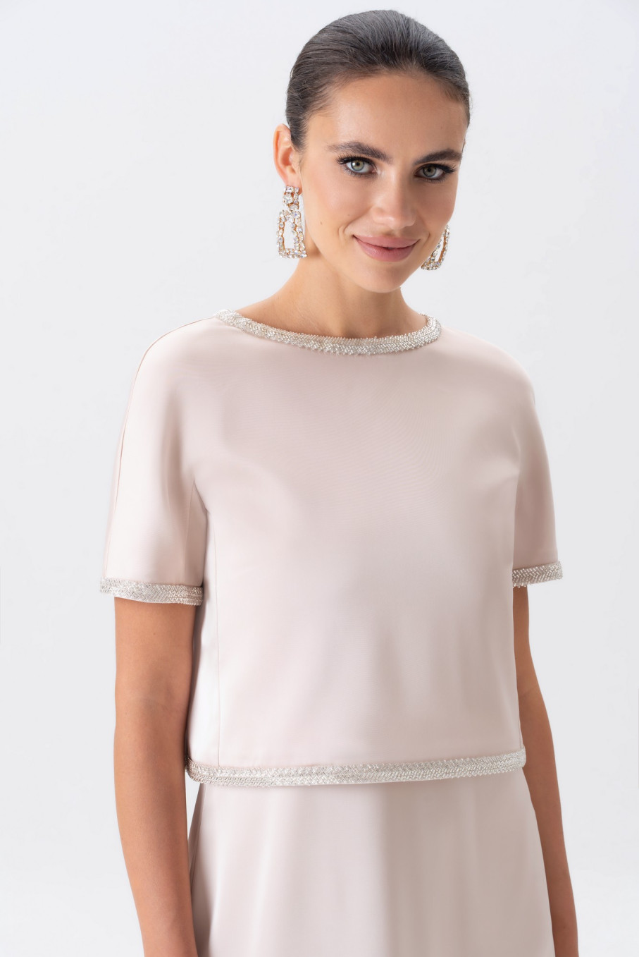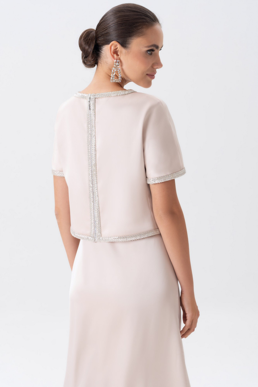 Низа переда, спинки и рукавов, горловина, застежка спинки вдоль молнии декорированы отделочной тесьмой из сетки с нашивными бусинами (размер и цвет фурнитуры может незначительно отличаться от фото).