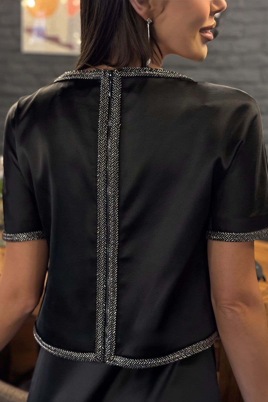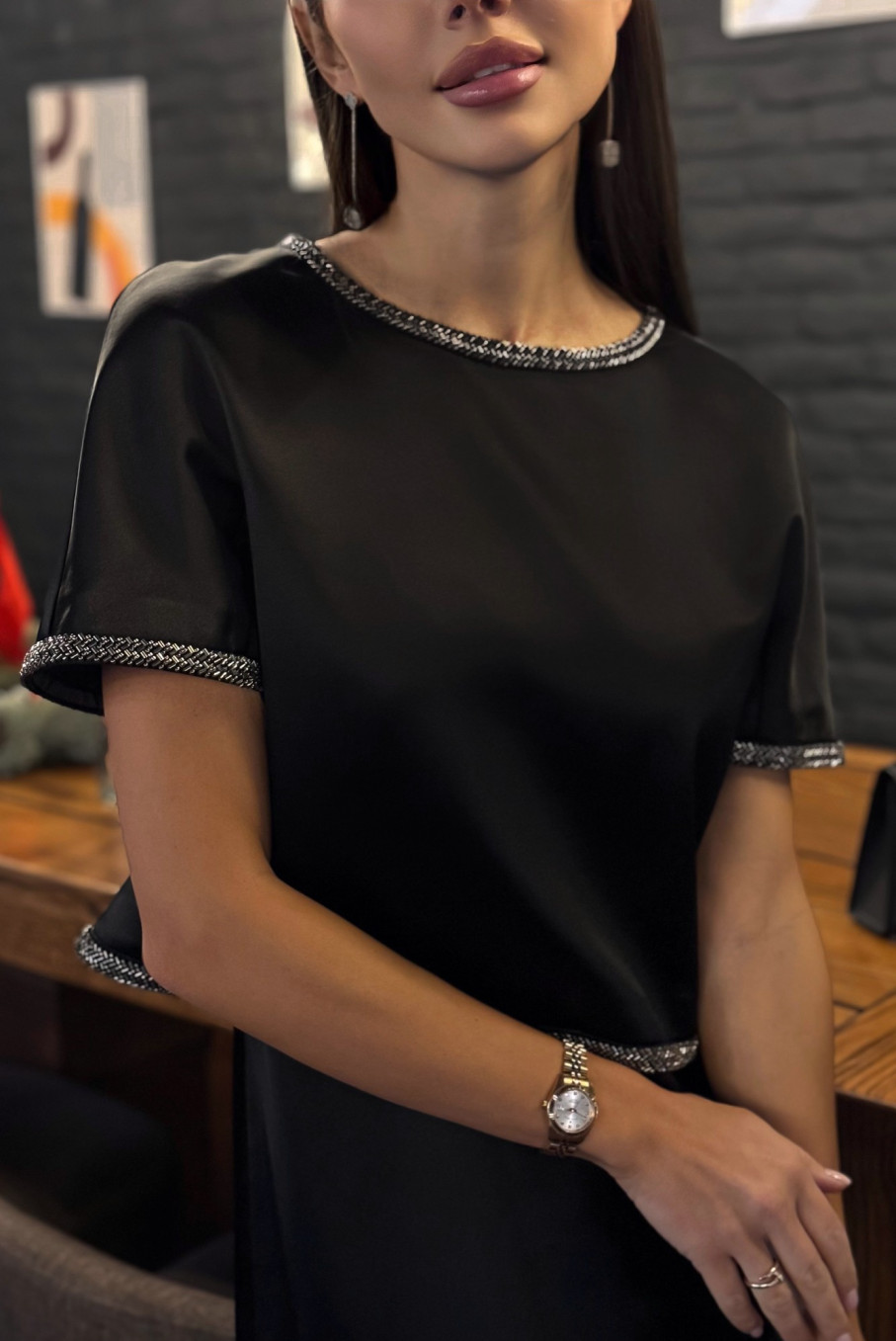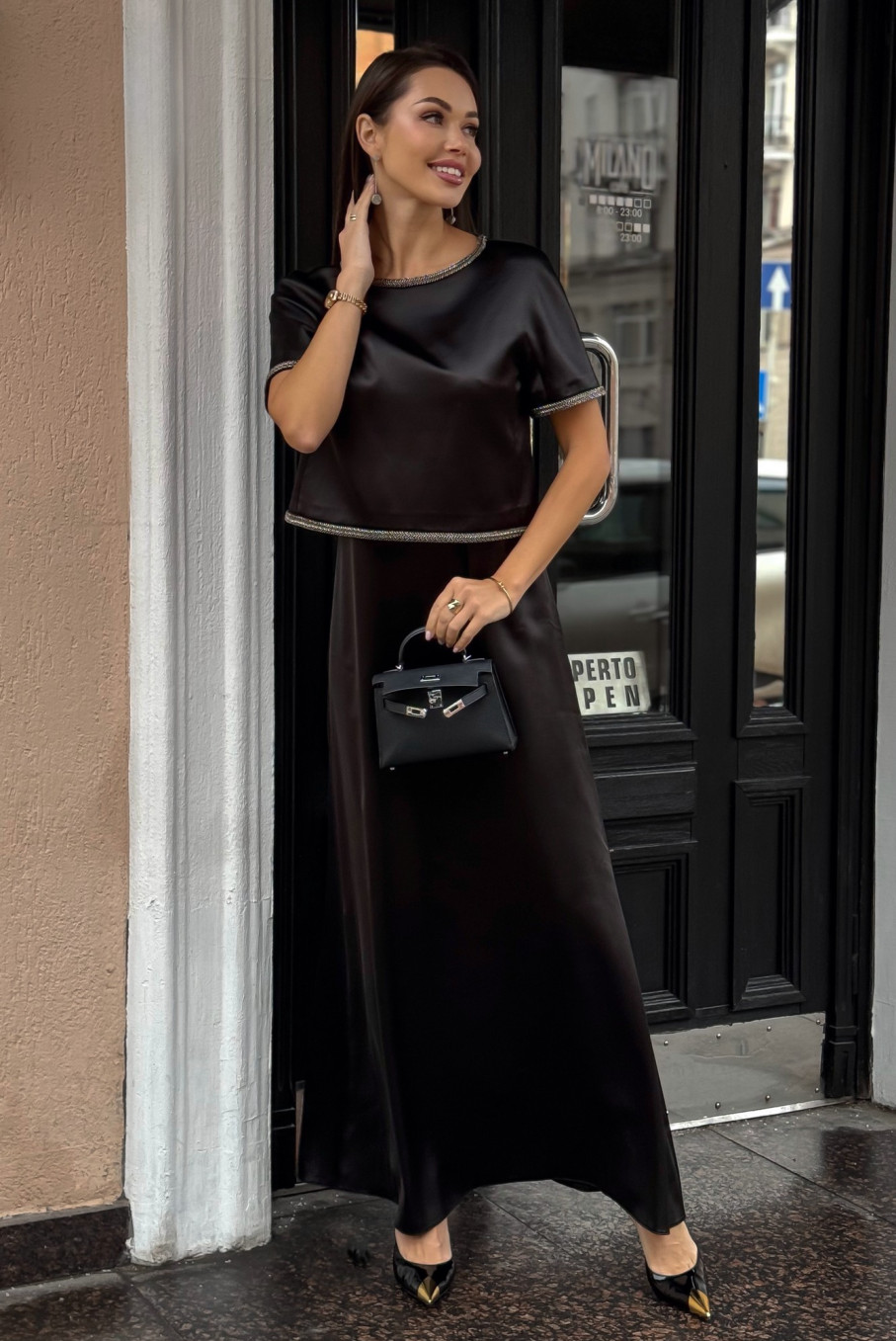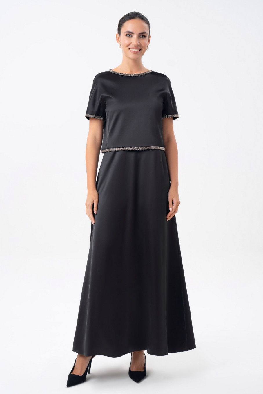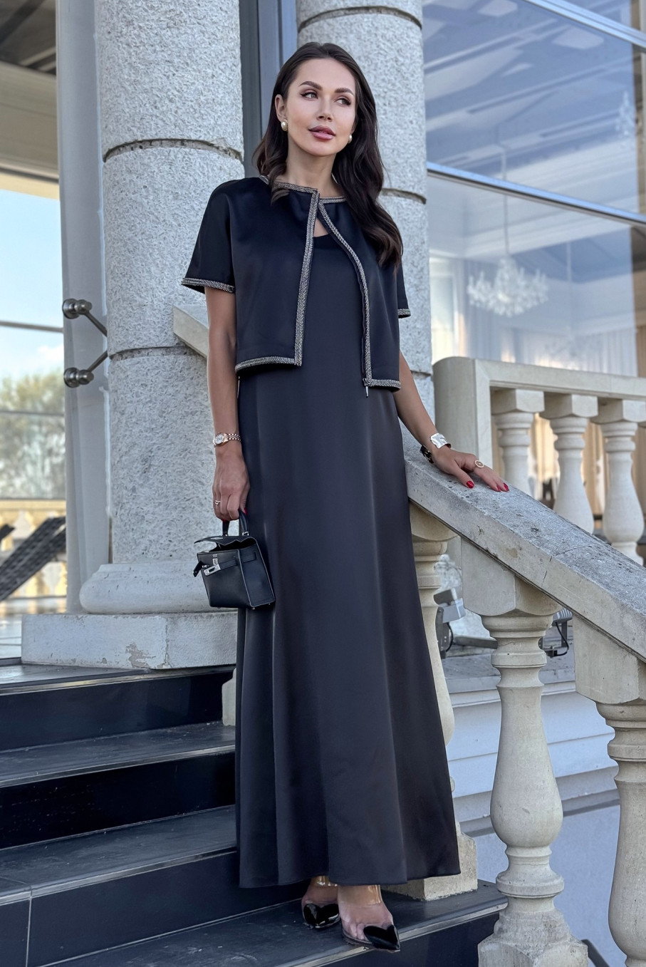 Нарядный черный костюм с платьем URS - это элегантный вариант для торжественных случаев, созданный для женщин, которые ценят выдержанную классику, благородный блеск и по-настоящему женственный силуэт. Этот праздничный комплект сочетает в себе утонченное длинное платье в пол и укороченный верх с красивой декоративной отделкой. Такой ансамбль дает ощущение безупречного вкуса и уверенности: именно тот случай, когда наряд работает на образ, а не наоборот.