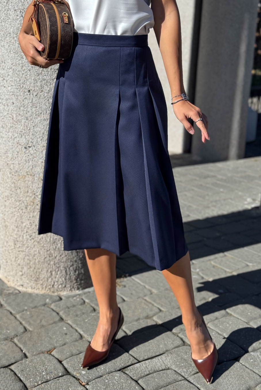 Юбка расклешенная к низу, на отлетной подкладке, на притачном поясе, застегивающимся на 1 петлю и пуговицу. Переднее полотнище с тремя парами складок. Складки частично застрочены от пояса и заутюжены до низа. Заднее полотнище с талиевыми вытачками, со средним швом, в верхней части которого обработана застежка на потайную тесьму-молнию. В 50,52,54 размерах в поясе предусмотрены резинки для лучшего прилегания по талии.