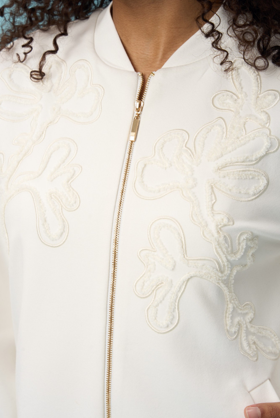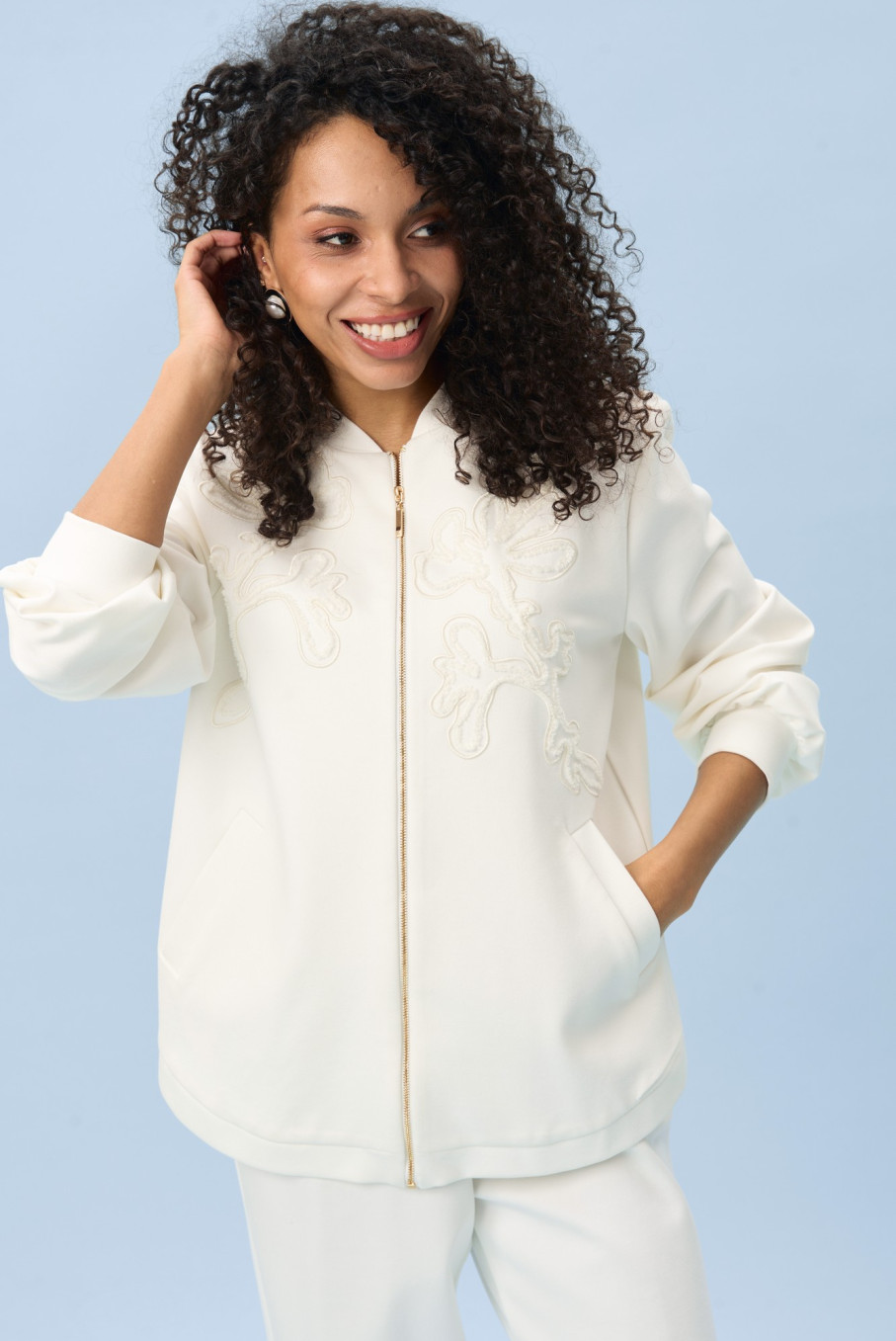 Жакет прямого силуэта, с центральной бортовой застежкой на металлическую тесьму – молнию от низа до верха (размер и цвет фурнитуры может незначительно отличаться от фото). По переду и спинке в верхней части с художественно-декоративной вышивкой. Перед и спинка на подкладке.