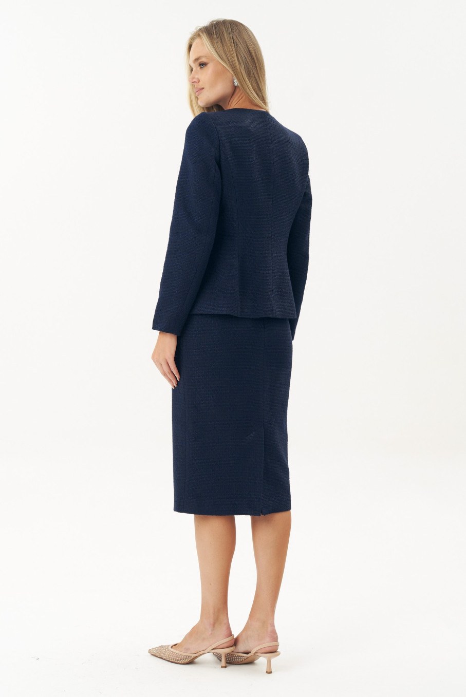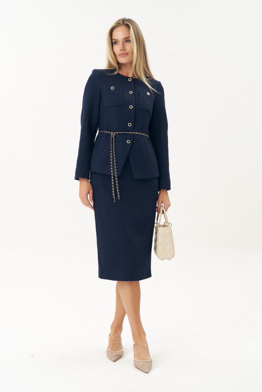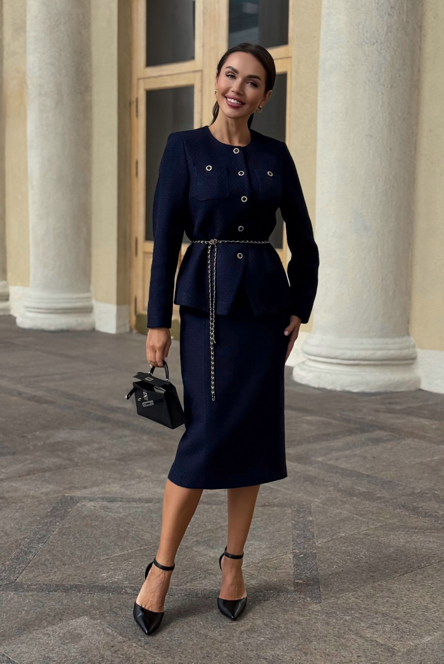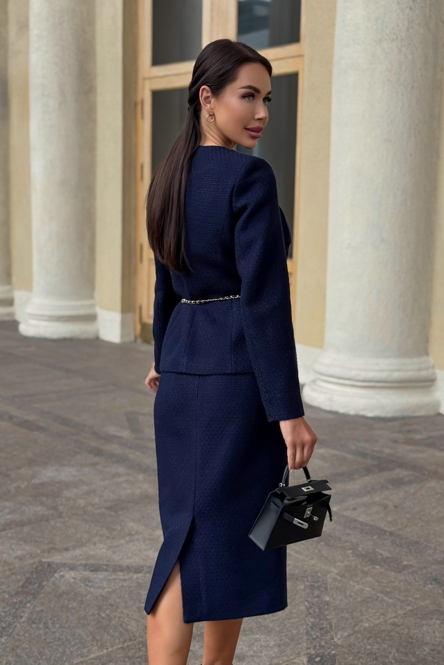 Синий твидовый костюм женский с юбкой URS представляет собой универсальный комплект, состоящий из аккуратного жакета и юбки миди. Строгий крой, продуманная посадка и благородный оттенок делают этот костюм идеальным выбором для офиса, деловых мероприятий, презентаций и торжественных событий. Твидовая текстура придает образу статусность, а сдержанный силуэт – утонченность. Такой костюм двойка подчеркивает фигуру, создавая аккуратный образ без излишней вычурности.