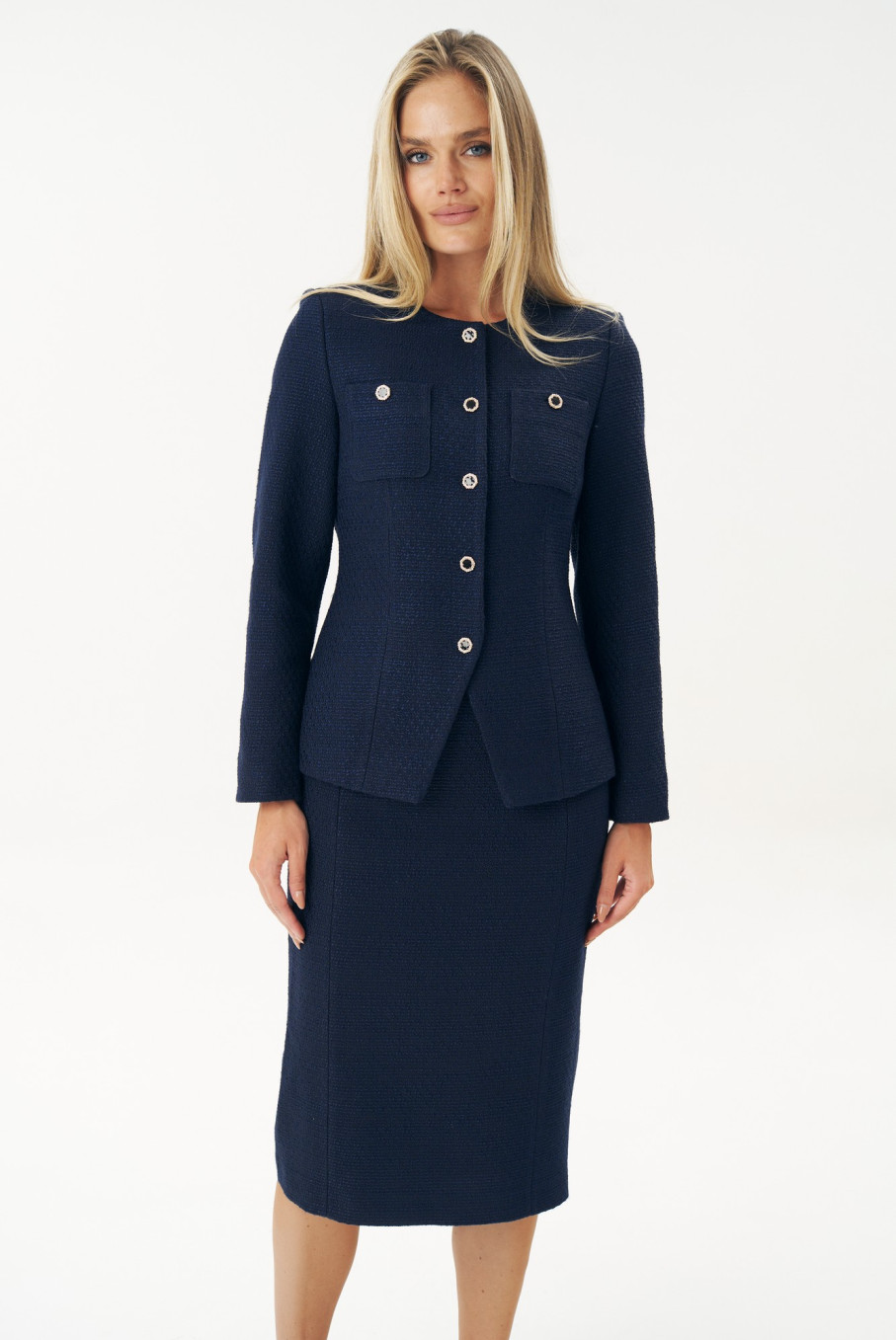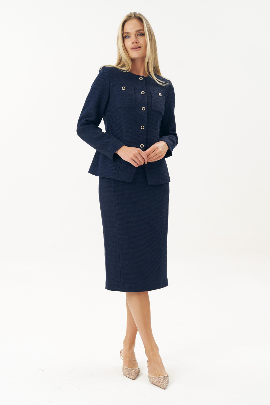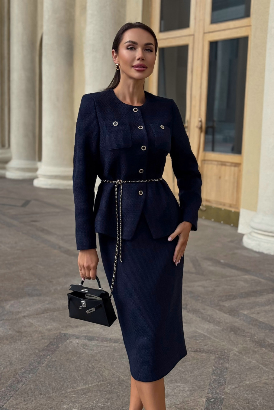 Синий твидовый костюм женский ЮРС – это не только практичность, но и визуальная привлекательность. Глубокий благородный оттенок подчеркивает фактуру ткани, создавая визуальный объем и мягкую игру света. Он легко сочетается со светлыми, темными и пастельными аксессуарами, что делает костюм идеальной базой для минималистичных и элегантных образов.