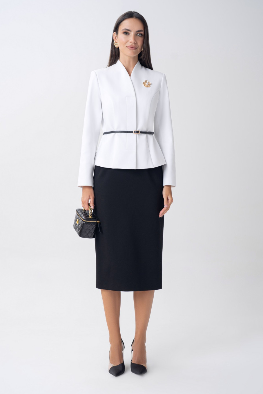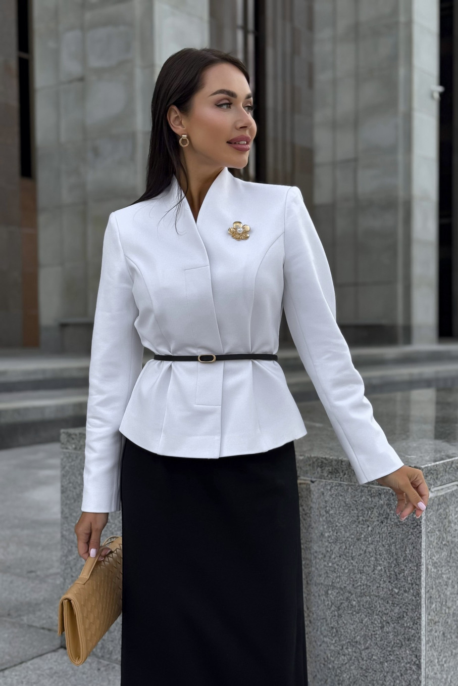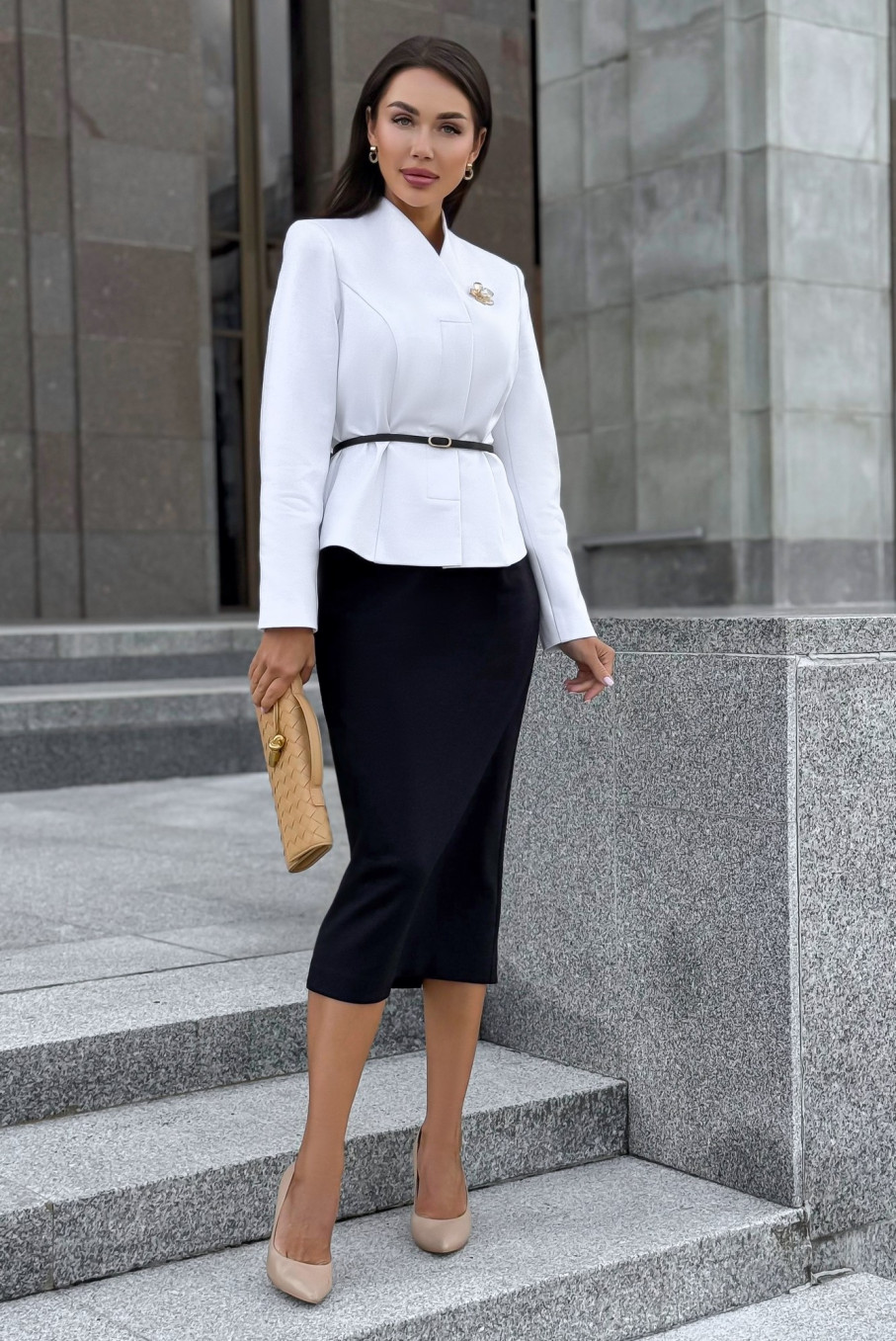 Белый жакет и чёрная юбка — вечная классика, создающая идеальный контрастный дуэт. Такой чёрно-белый костюм всегда выглядит дорого, свежо и уместно в любой ситуации.