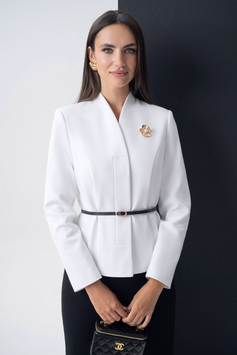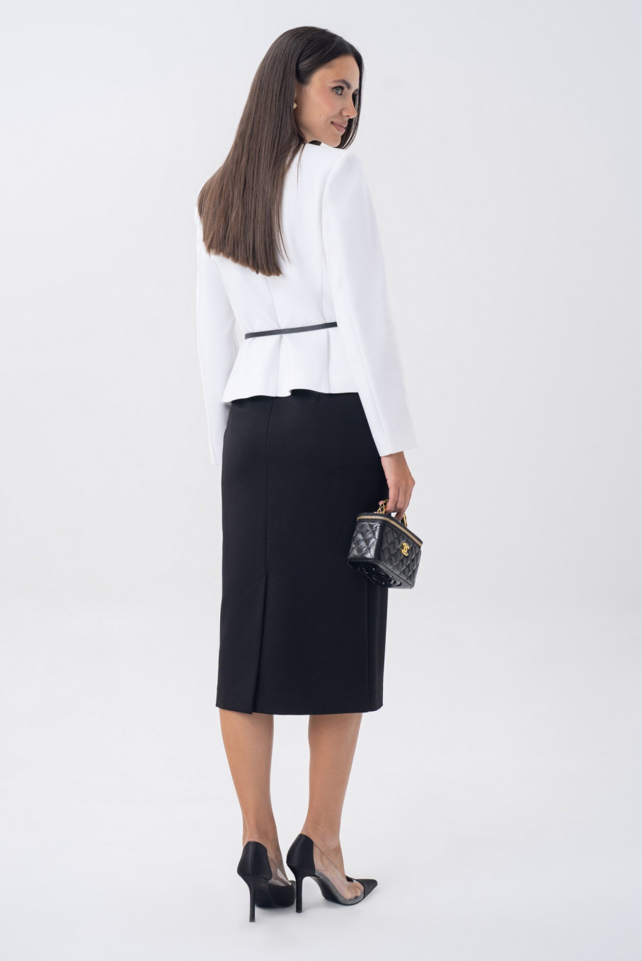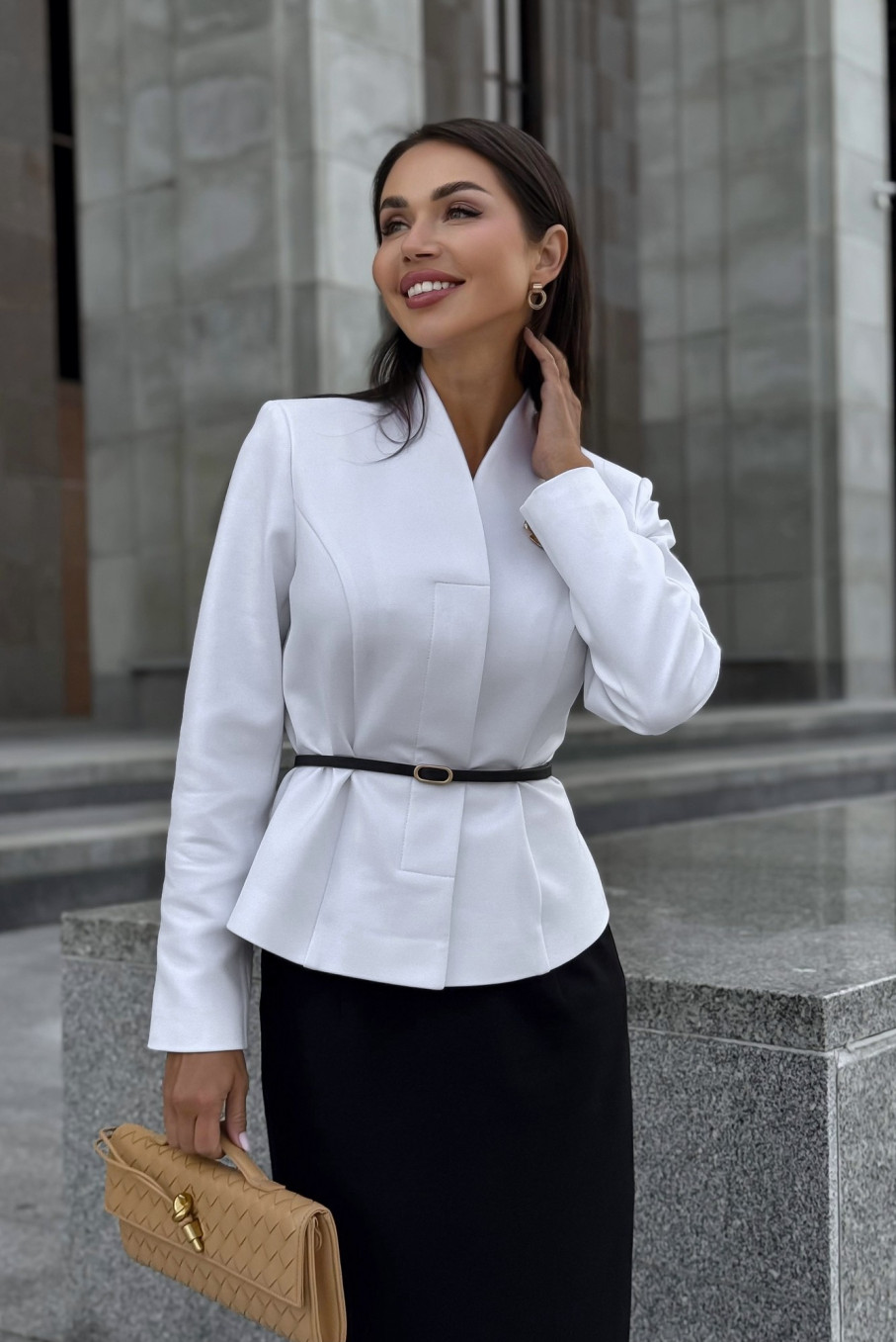 Белый жакет и чёрная юбка — вечная классика, создающая идеальный контрастный дуэт. Такой чёрно-белый костюм всегда выглядит дорого, свежо и уместно в любой ситуации.