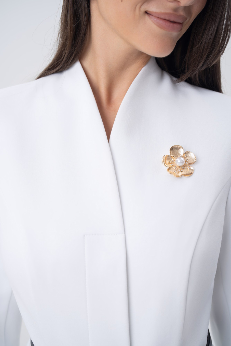 Особое внимание уделено деталям: аккуратные вытачки, безупречные линии, небольшой ремень, подчёркивающий талию, и изысканная брошь — всё это делает костюм по-настоящему статусным.