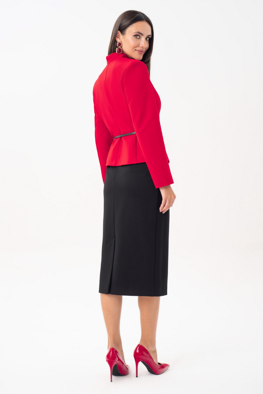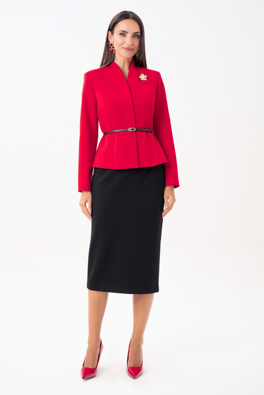 Костюм с юбкой ЮРС выполнен в классическом сочетании — красный жакет и чёрная юбка. Такое цветовое решение символизирует уверенность, внутреннюю силу и безупречный вкус. Красный верх придаёт образу энергии, а чёрная юбка-карандаш добавляет строгости и сдержанности, создавая гармоничный баланс.