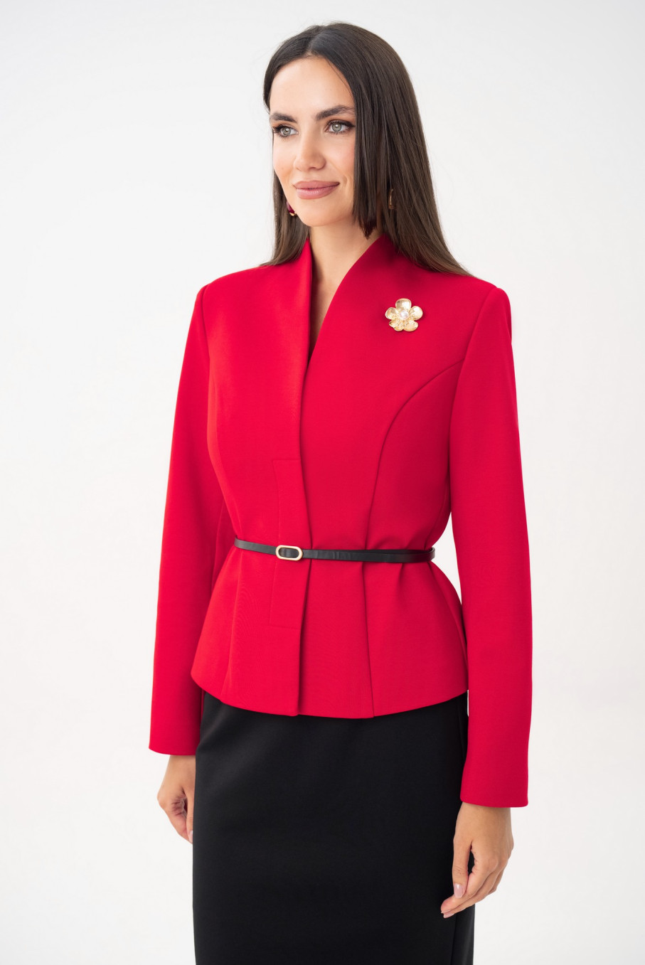 Модель отличается продуманной архитектурой кроя — жакет с мягкой линией плеч, фигурными вытачками и акцентом на талии благодаря тонкому ремешку. Такой фасон создаёт идеальный силуэт «песочные часы» и визуально делает фигуру стройнее.