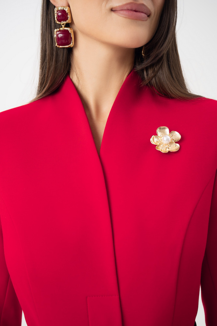 Жакет с воротником-стойкой и аккуратной застёжкой визуально вытягивает шею, делая образ более благородным и изысканным. Акцентная брошь и тонкий ремень придают костюму изюминку, превращая его в стильный элемент гардероба, где каждая деталь продумана.