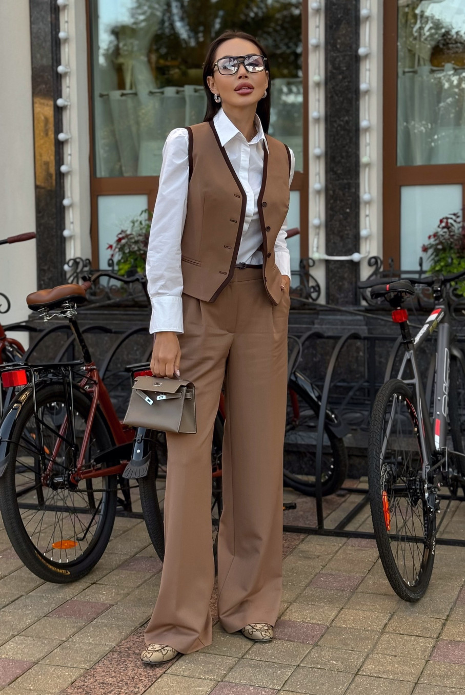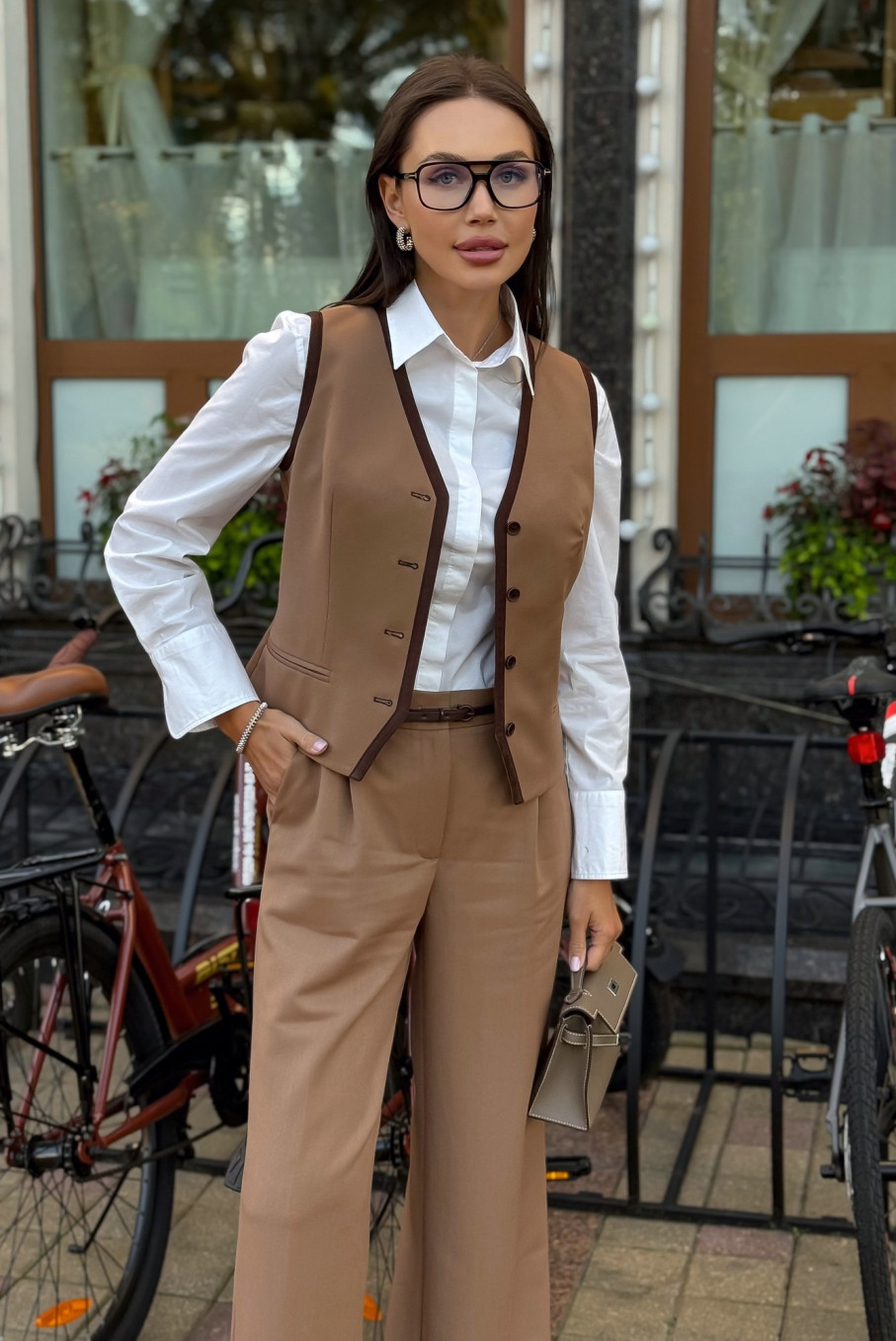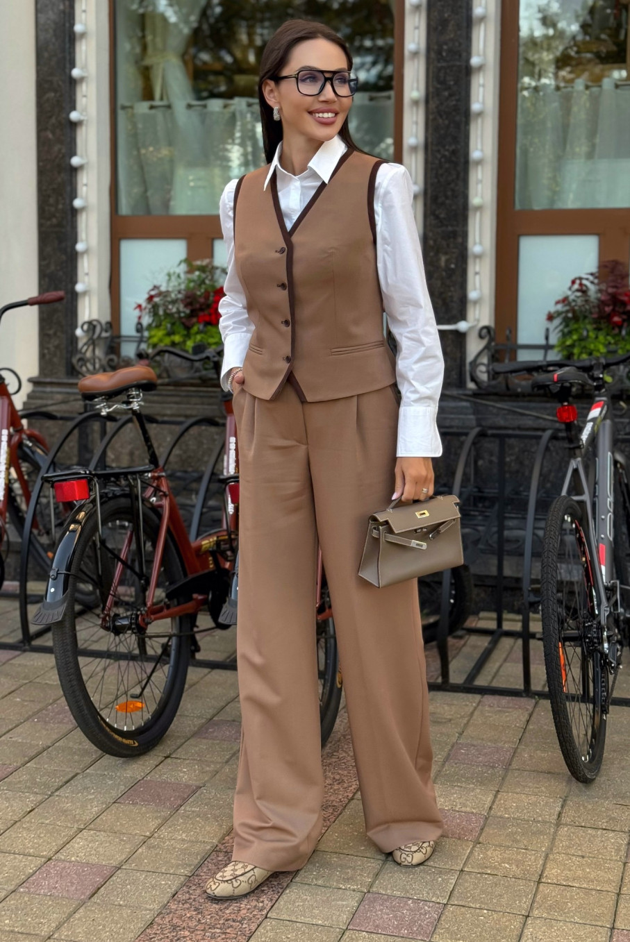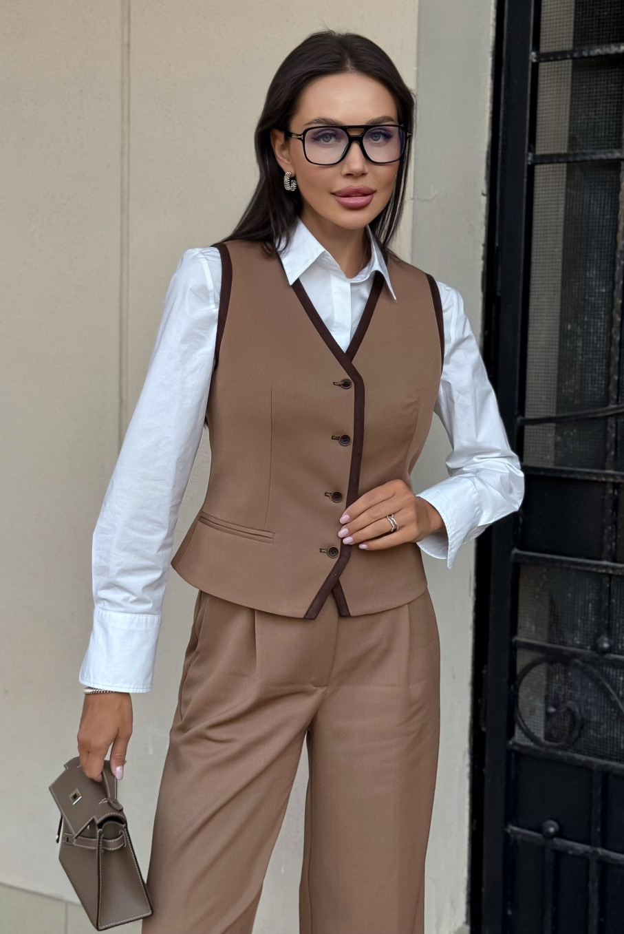 Брючный костюм женский URS сочетает в себе деловую строгость и женственность. Мягкий коричнево-бежевый оттенок подчеркивает утончённость образа, а контрастная отделка жилета добавляет выразительности. Такой женский костюм с жилетом и брюками легко адаптируется под разные ситуации: от деловой встречи до стильного повседневного выхода в город.