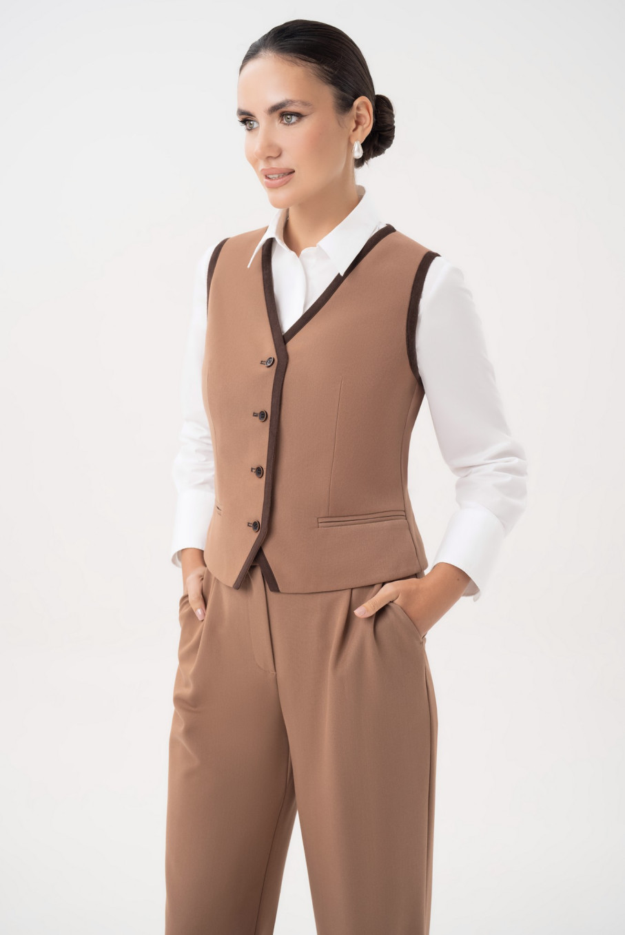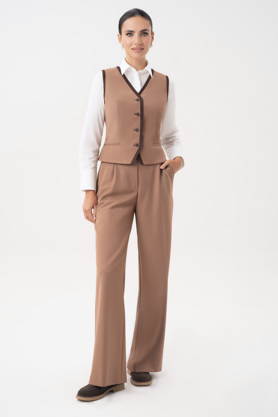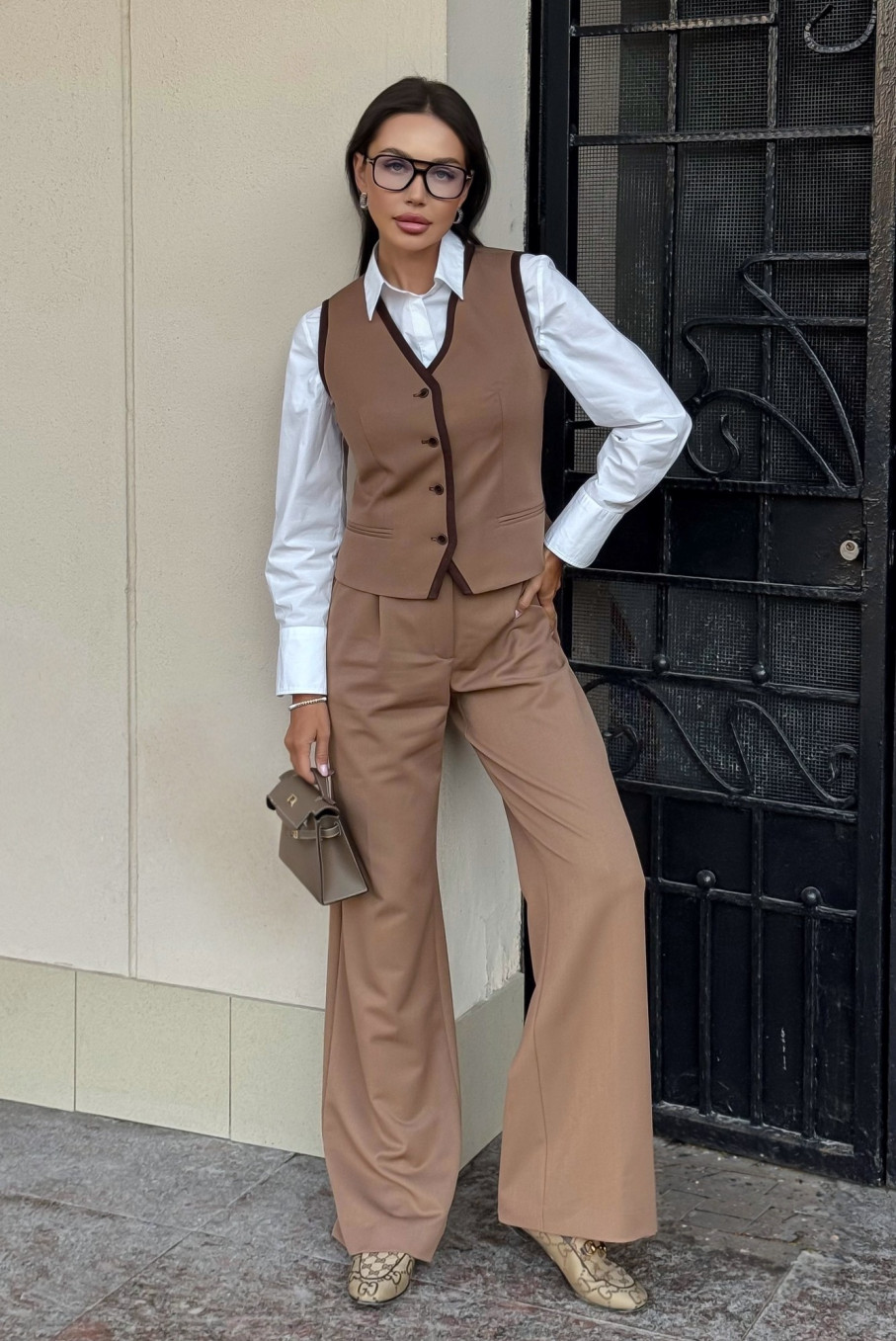 Брючный костюм женский URS сочетает в себе деловую строгость и женственность. Мягкий коричнево-бежевый оттенок подчеркивает утончённость образа, а контрастная отделка жилета добавляет выразительности. Такой женский костюм с жилетом и брюками легко адаптируется под разные ситуации: от деловой встречи до стильного повседневного выхода в город.