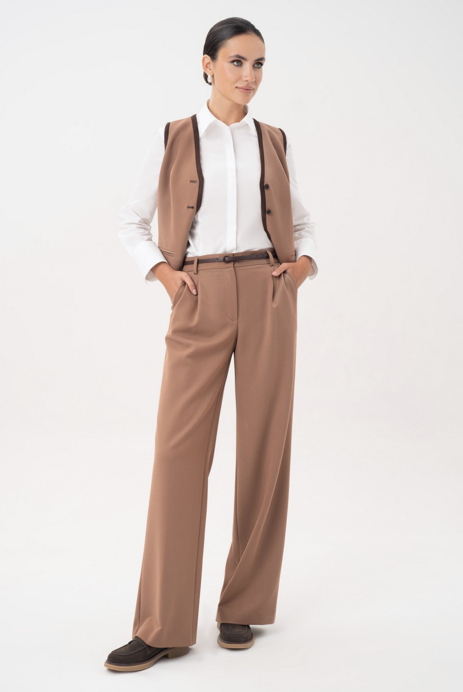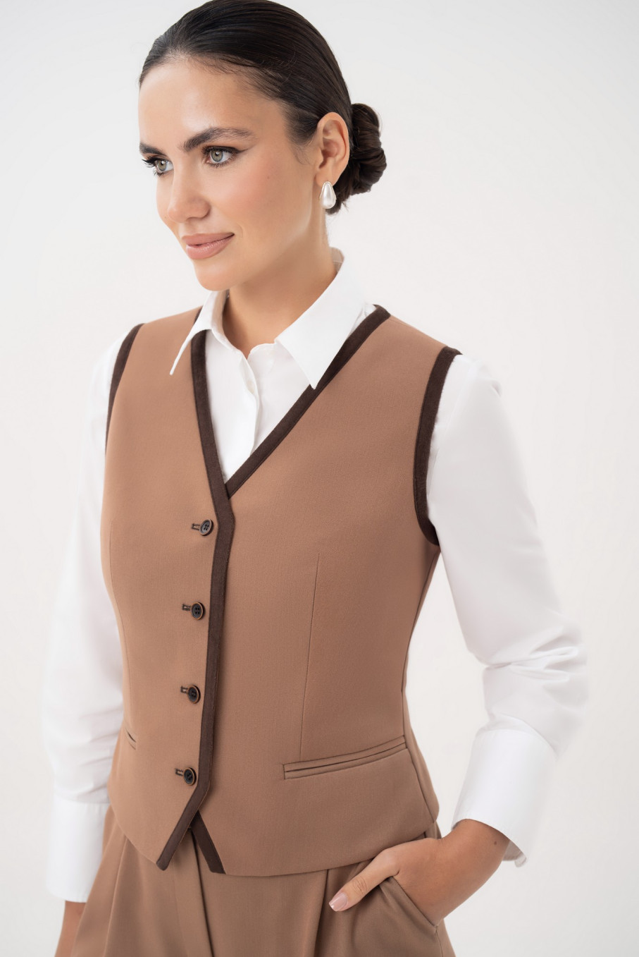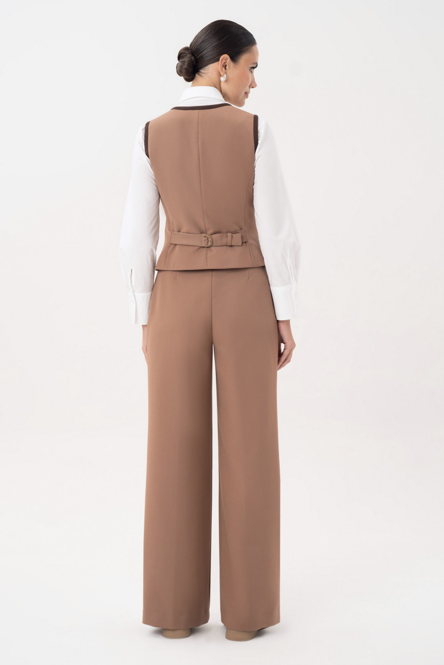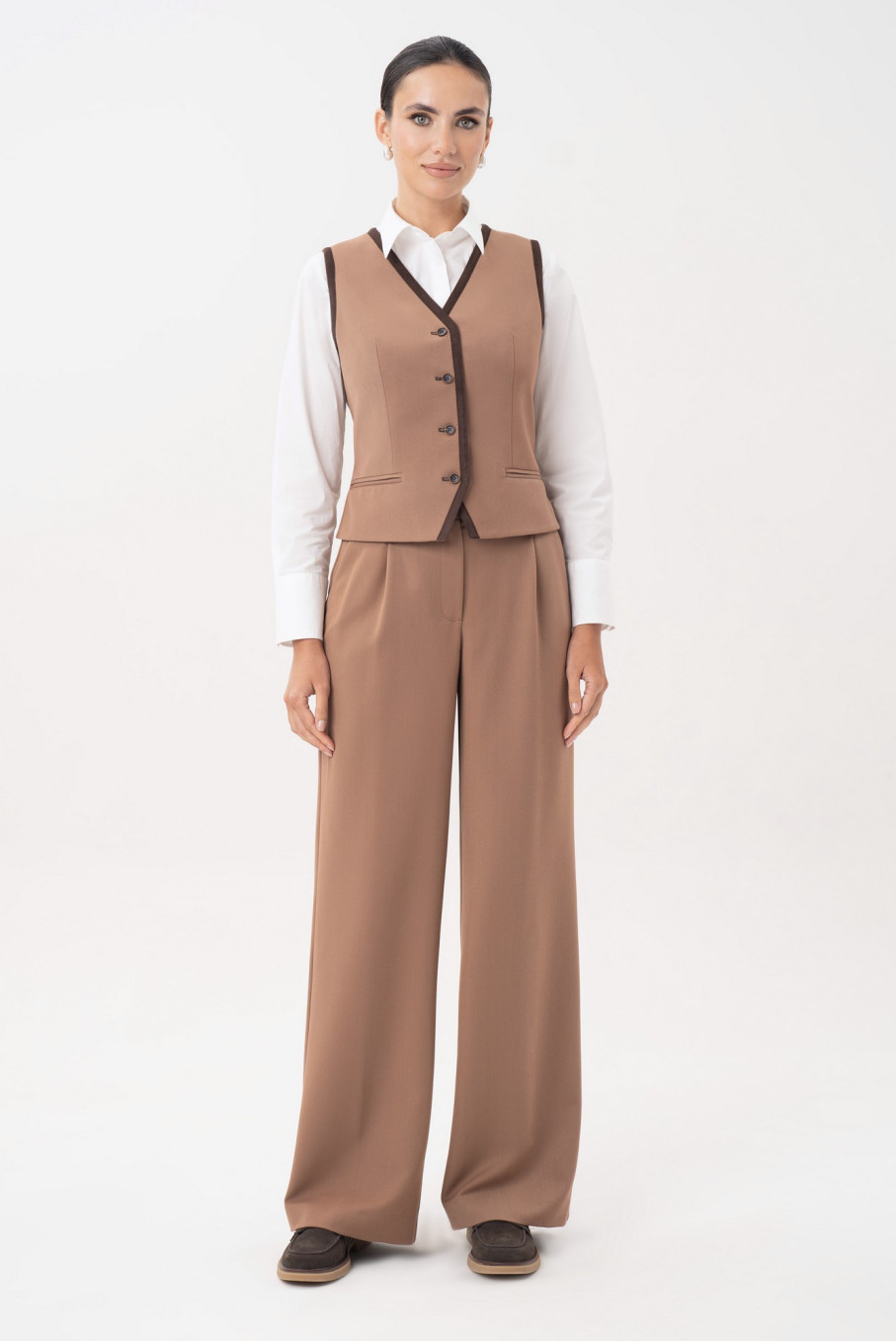 Брючный костюм женский URS сочетает в себе деловую строгость и женственность. Мягкий коричнево-бежевый оттенок подчеркивает утончённость образа, а контрастная отделка жилета добавляет выразительности. Такой женский костюм с жилетом и брюками легко адаптируется под разные ситуации: от деловой встречи до стильного повседневного выхода в город.