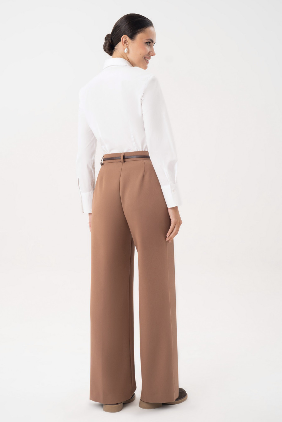 Брюки женские, прямые, на притачном поясе, с 5-ю шлевками, с застежкой на тесьму - «молнию», расположенную в среднем шве передних половинок. Пояс застегивается спереди на 1 пришивной крючок, 1 потайную петлю и пуговицу. Передние половинки брюк с односторонними складками, с боковыми наклонными карманами. Складки застрочены от пояса вниз на 3,0 см. Задние половинки с вытачками. Брюки без заутюженных стрелок.