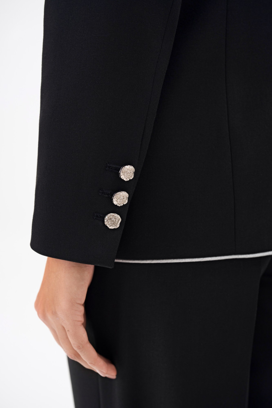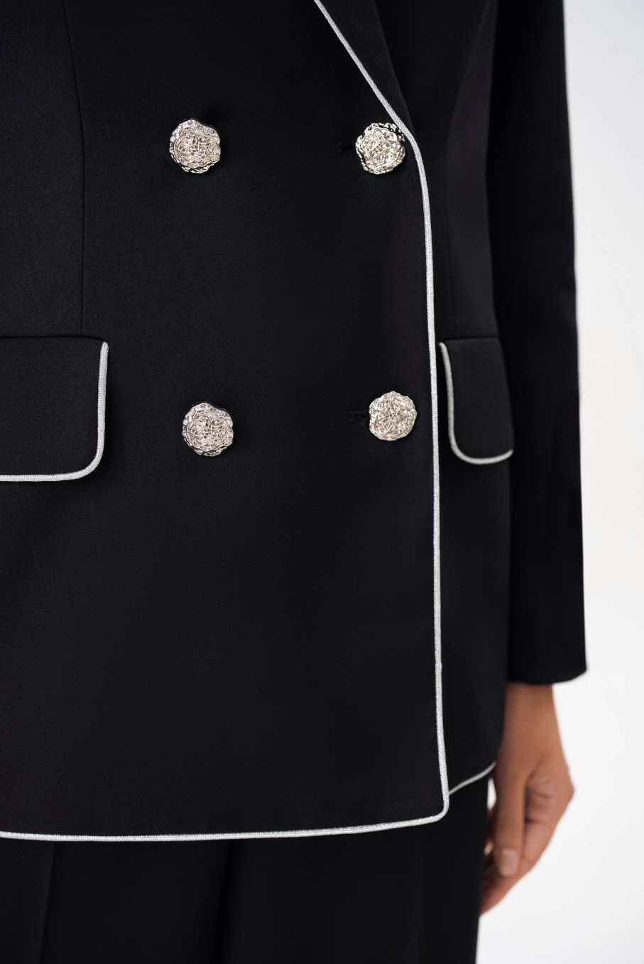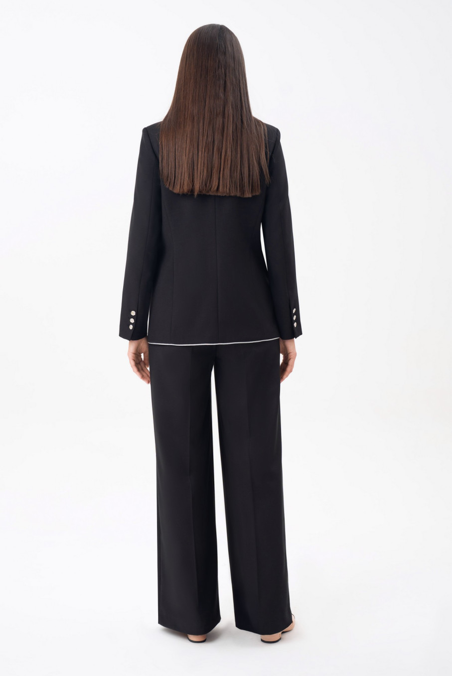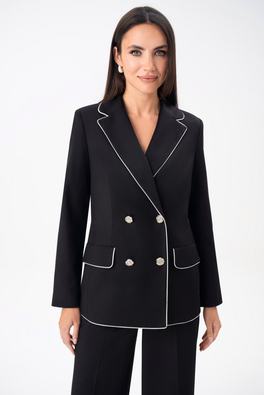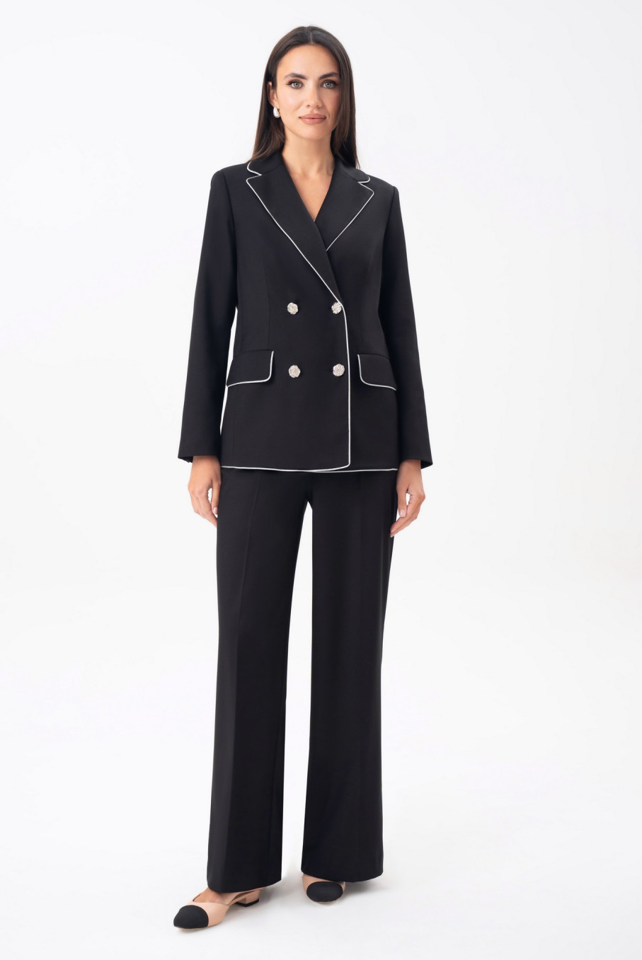 Особое внимание заслуживает отделка: контрастный белый кант подчеркивает линии кроя, создавая ощущение легкости и утонченности. Такой черный костюм женский классический с белыми акцентами выглядит свежо и современно, сохраняя приверженность традиционной элегантности бренда URS / ЮРС.