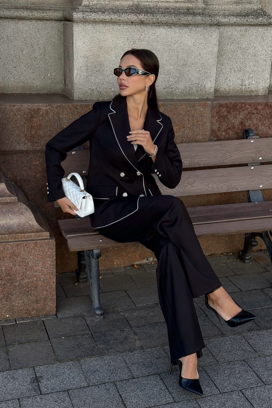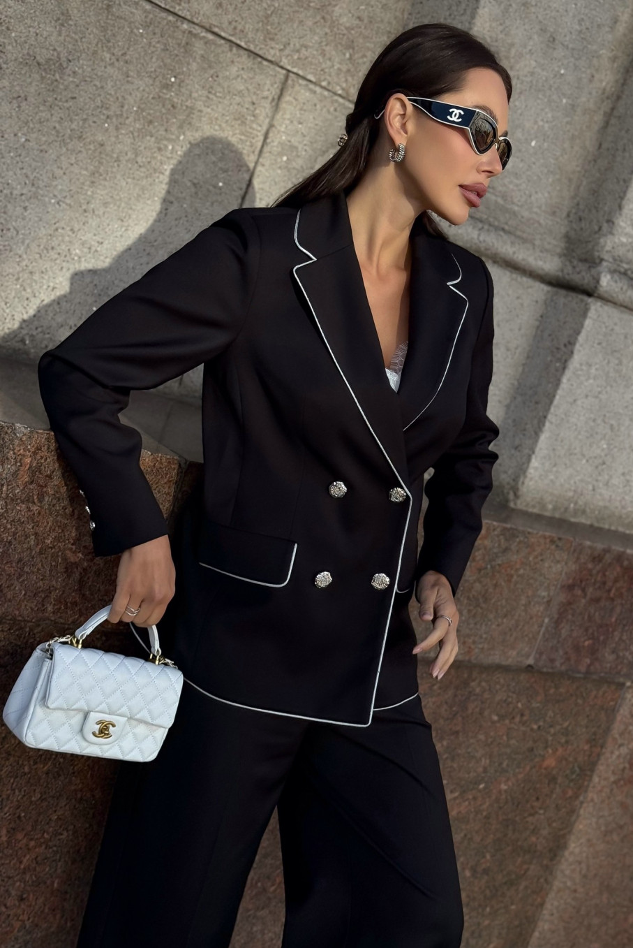 Благодаря универсальному черному цвету костюм легко сочетается с аксессуарами, обувью и сумками любых оттенков — от классического белого и бежевого до насыщенных контрастных тонов.