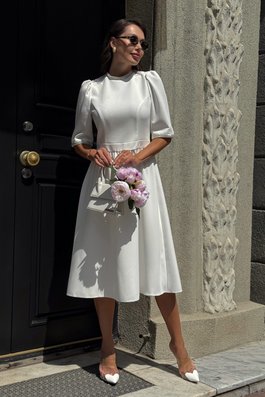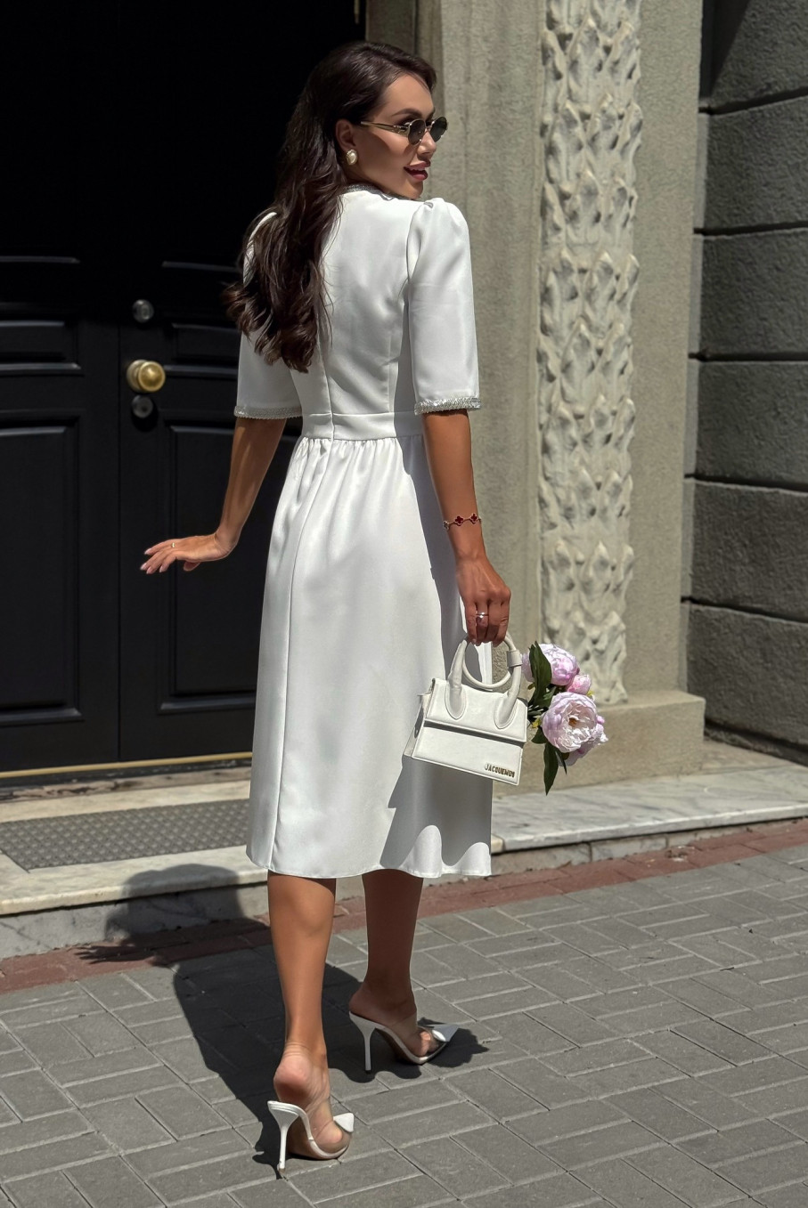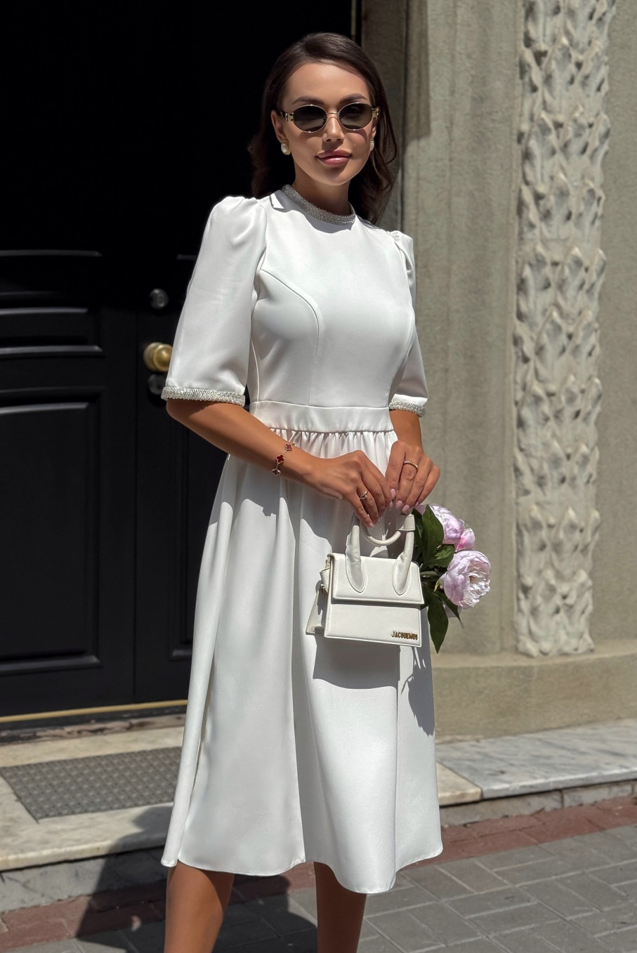 Белое элегантное платье миди URS — универсальная модель для повседневной элегантности и особых случаев. Полуприлегающий силуэт с отрезной талией подчёркивает фигуру, аккуратная сборка создаёт мягкое прилегание, а воротник-стойка и деликатная отделочная тесьма по горловине и рукавам добавляют нарядного блеска. Рельефные линии по переду и спинке визуально формируют «песочные часы», скрытая молния на спинке обеспечивает удобную посадку.