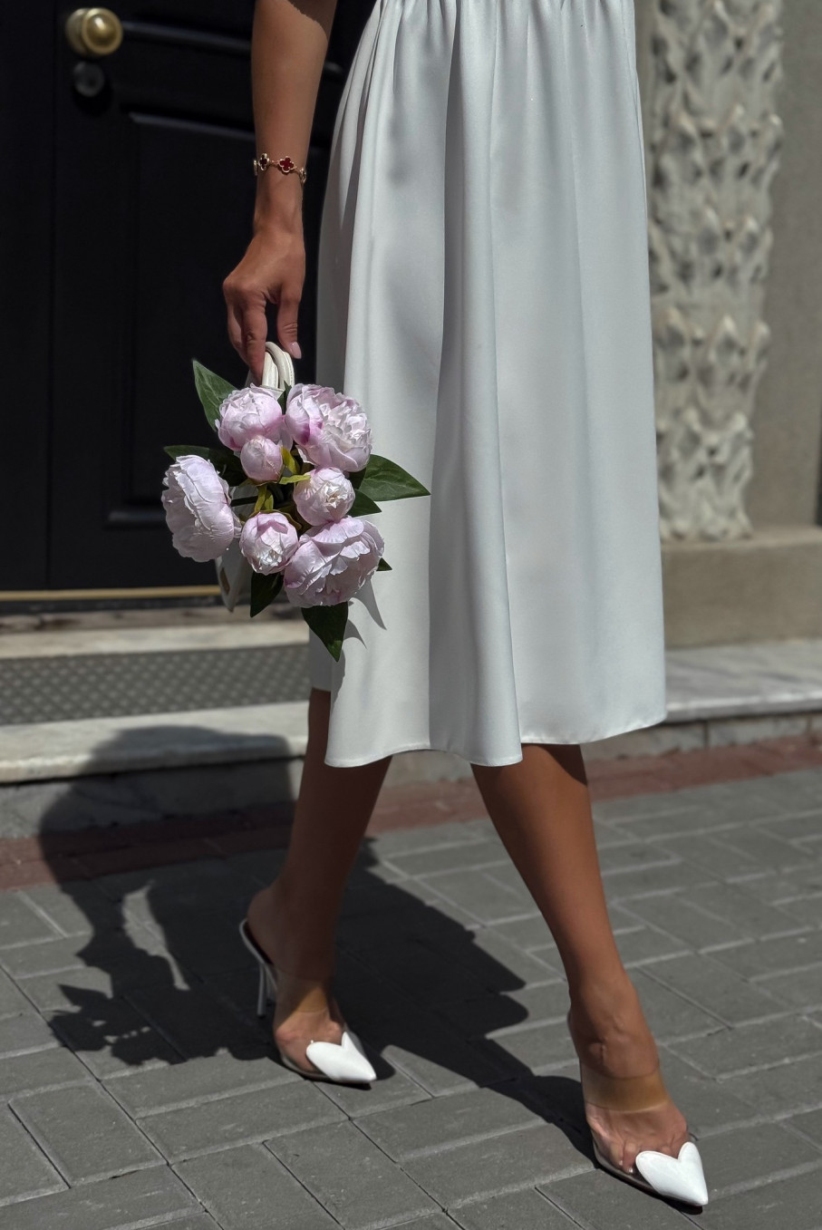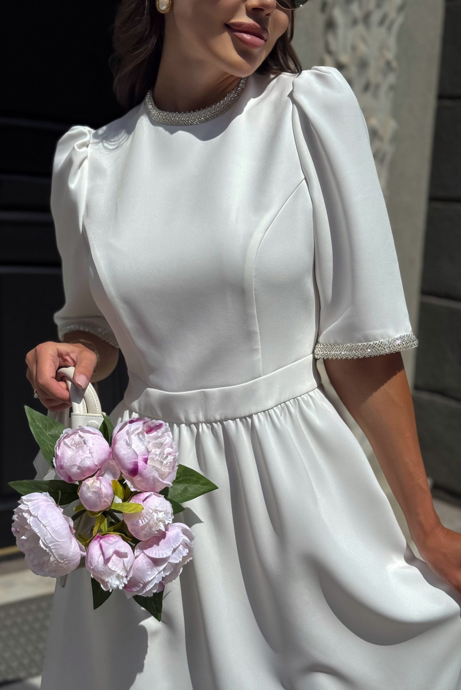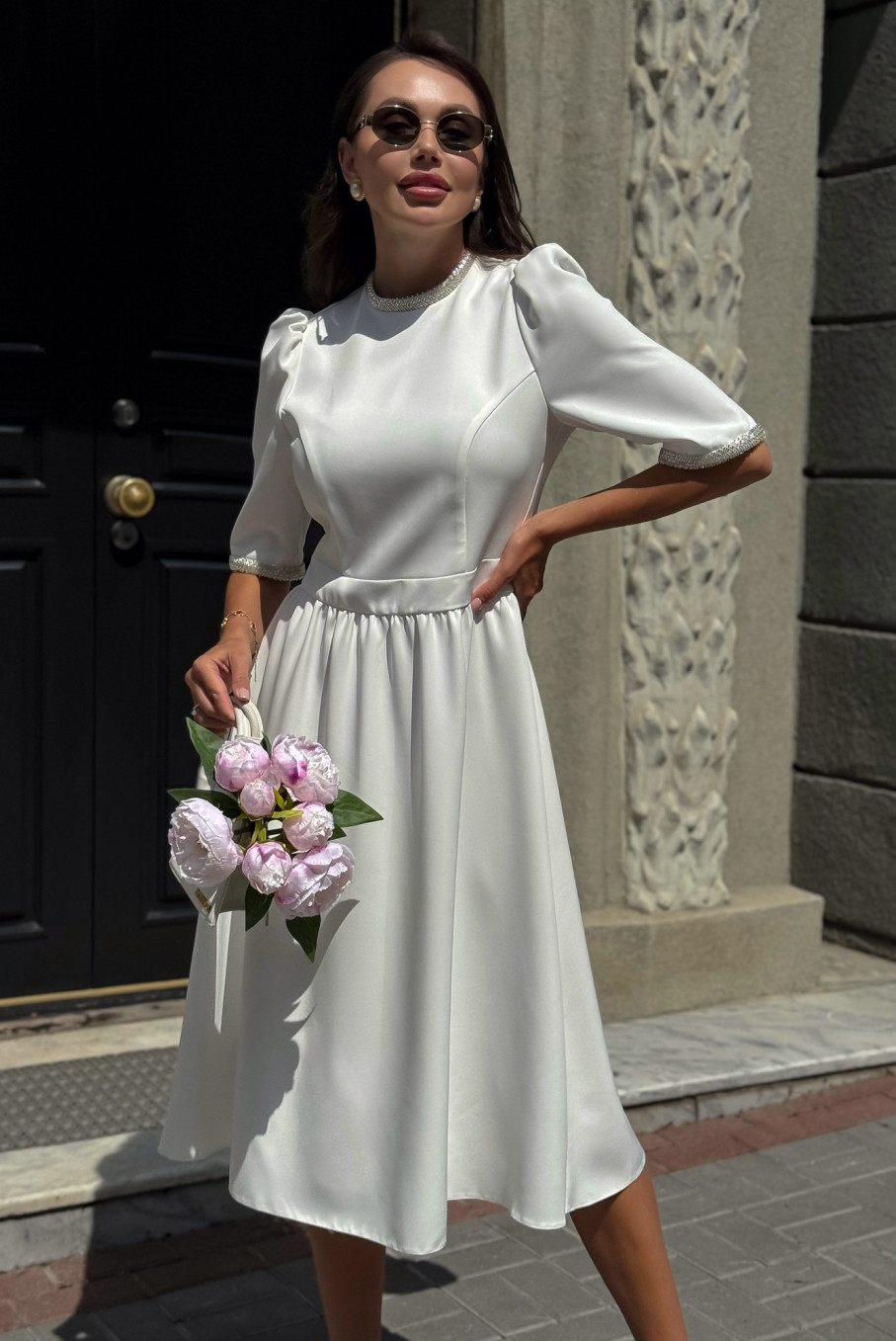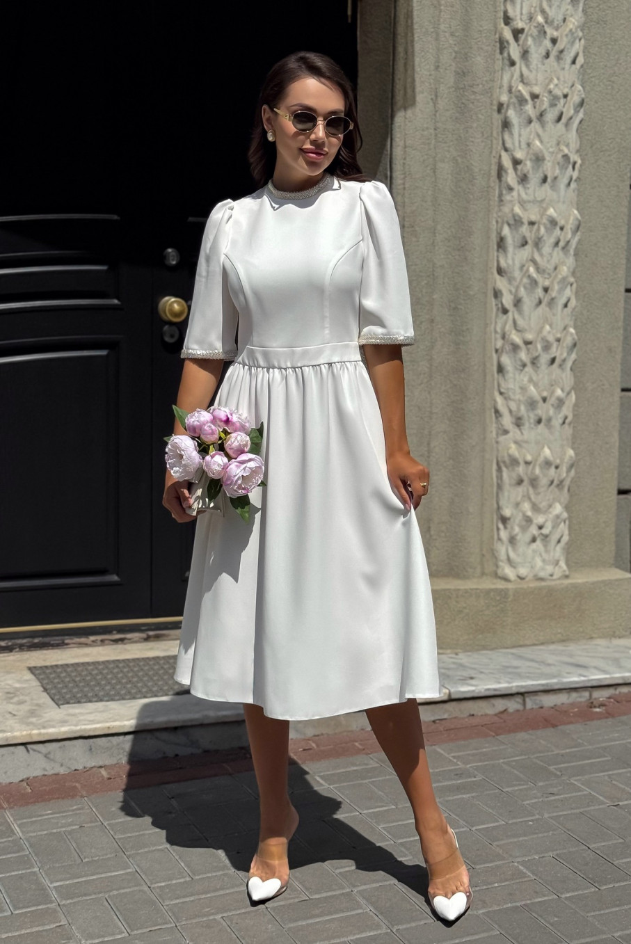 Белое элегантное платье миди URS — универсальная модель для повседневной элегантности и особых случаев. Полуприлегающий силуэт с отрезной талией подчёркивает фигуру, аккуратная сборка создаёт мягкое прилегание, а воротник-стойка и деликатная отделочная тесьма по горловине и рукавам добавляют нарядного блеска. Рельефные линии по переду и спинке визуально формируют «песочные часы», скрытая молния на спинке обеспечивает удобную посадку.