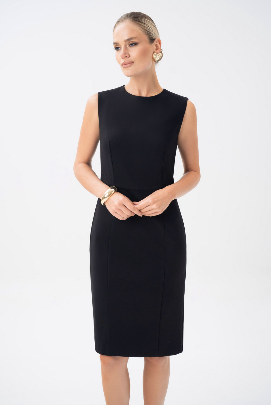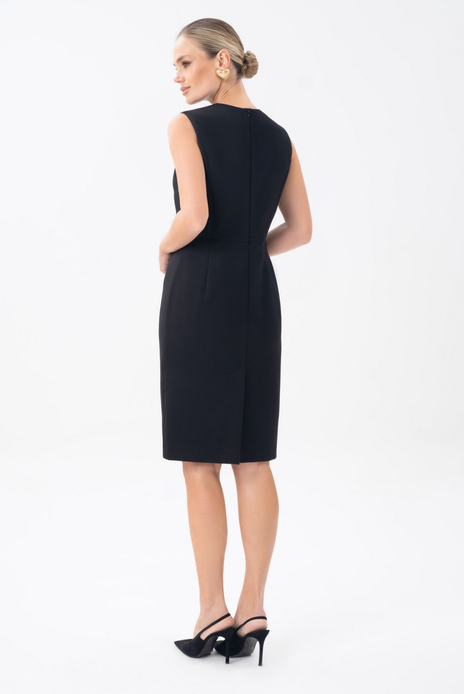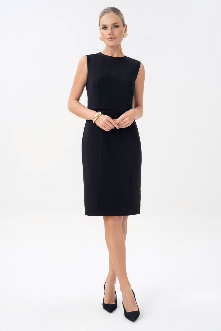 Модель выполнена в стиле платья-футляра миди, который визуально вытягивает силуэт, придавая фигуре гармоничные пропорции. Отсутствие рукавов делает платье лёгким и изящным, а плотная ткань отлично держит форму, создавая четкий контур без утяжеления. Это черное платье женское идеально подходит для офиса, деловых встреч, официальных мероприятий и ужинов — там, где важны строгость, вкус и уверенность в себе.