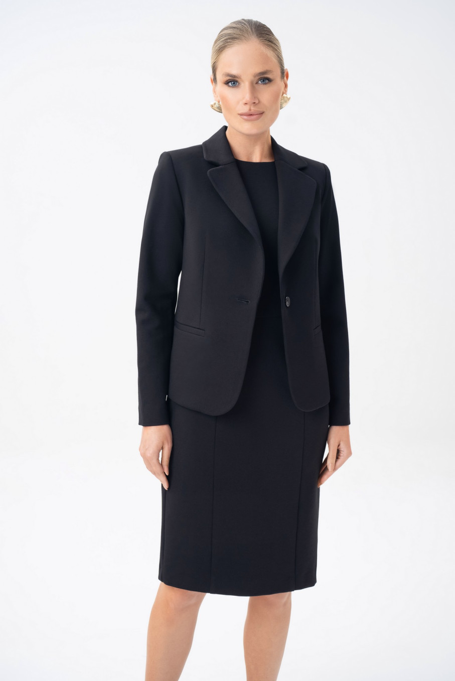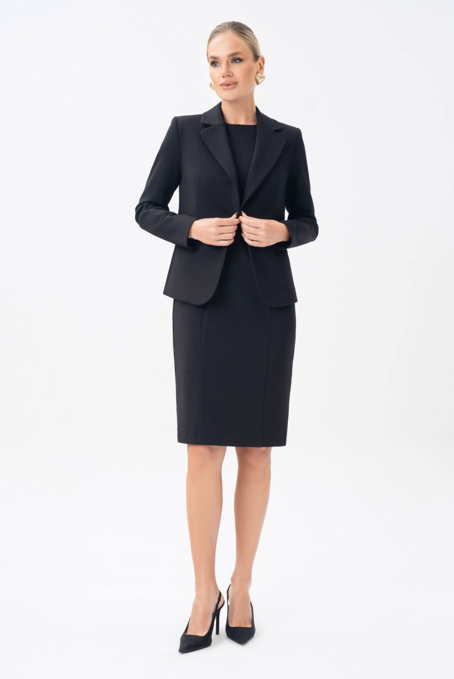 Это черное деловое платье женское создано для тех, кто выбирает качество, комфорт и традиционный стиль. Модель подчеркивает достоинства фигуры, не теряя изысканной сдержанности. Плотная ткань делает силуэт стройным, а черный цвет придает образу благородство и легкую загадочность.