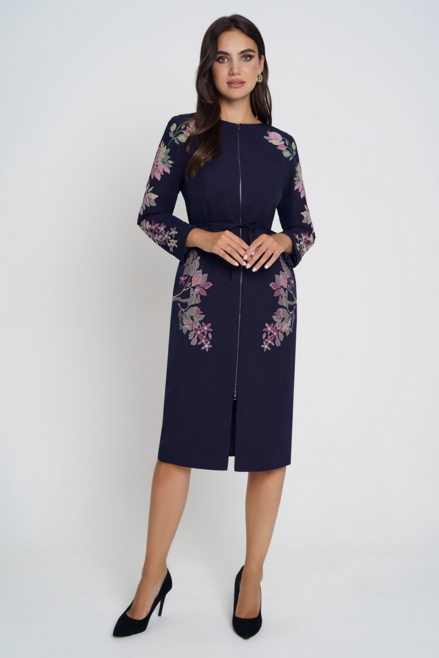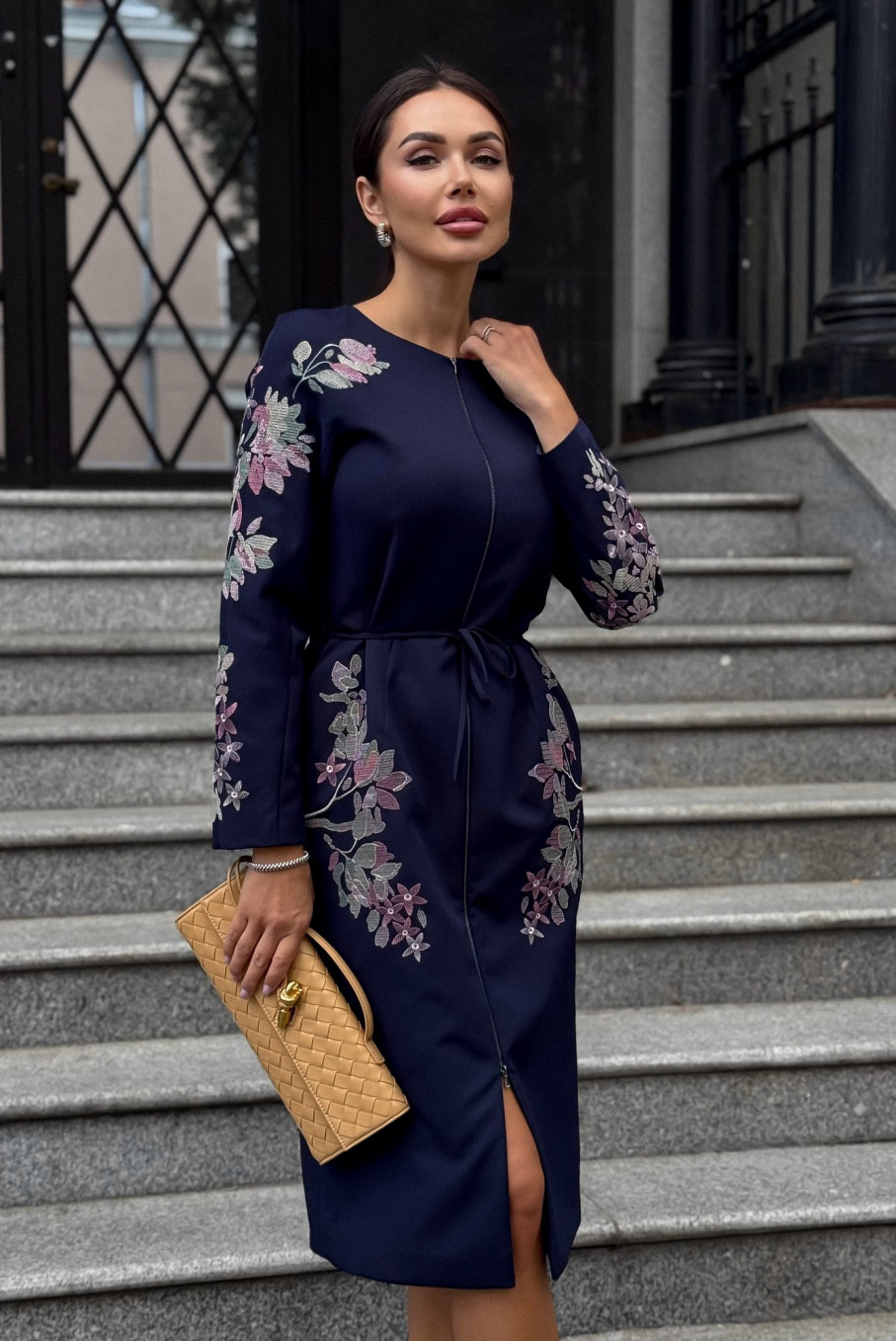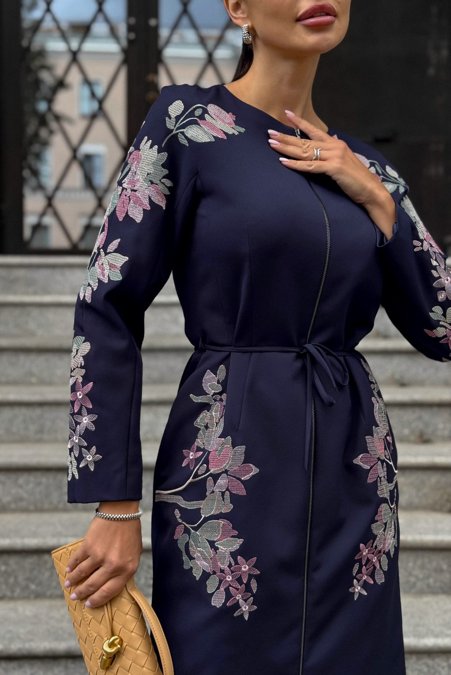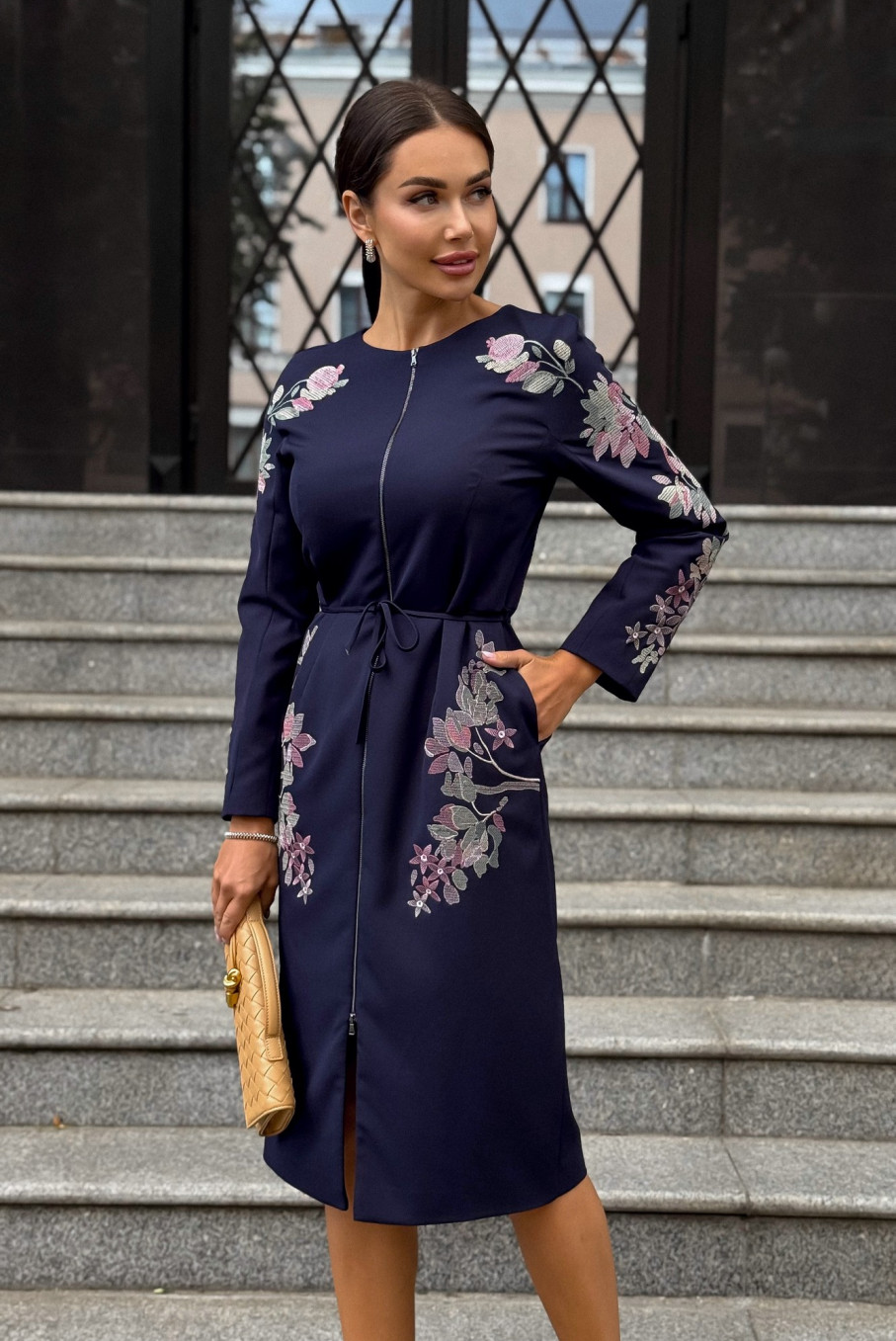 Темно-синий оттенок остается классикой женского гардероба. Он смотрится мягче, чем черный, но при этом сохраняет деловой характер и визуальную глубину. Вышивка добавляет образу индивидуальность и делает модель заметной без излишней вычурности. За счет этого платье женское праздничное выглядит дорого и современно, а в повседневной носке остается удобным вариантом на каждый день.