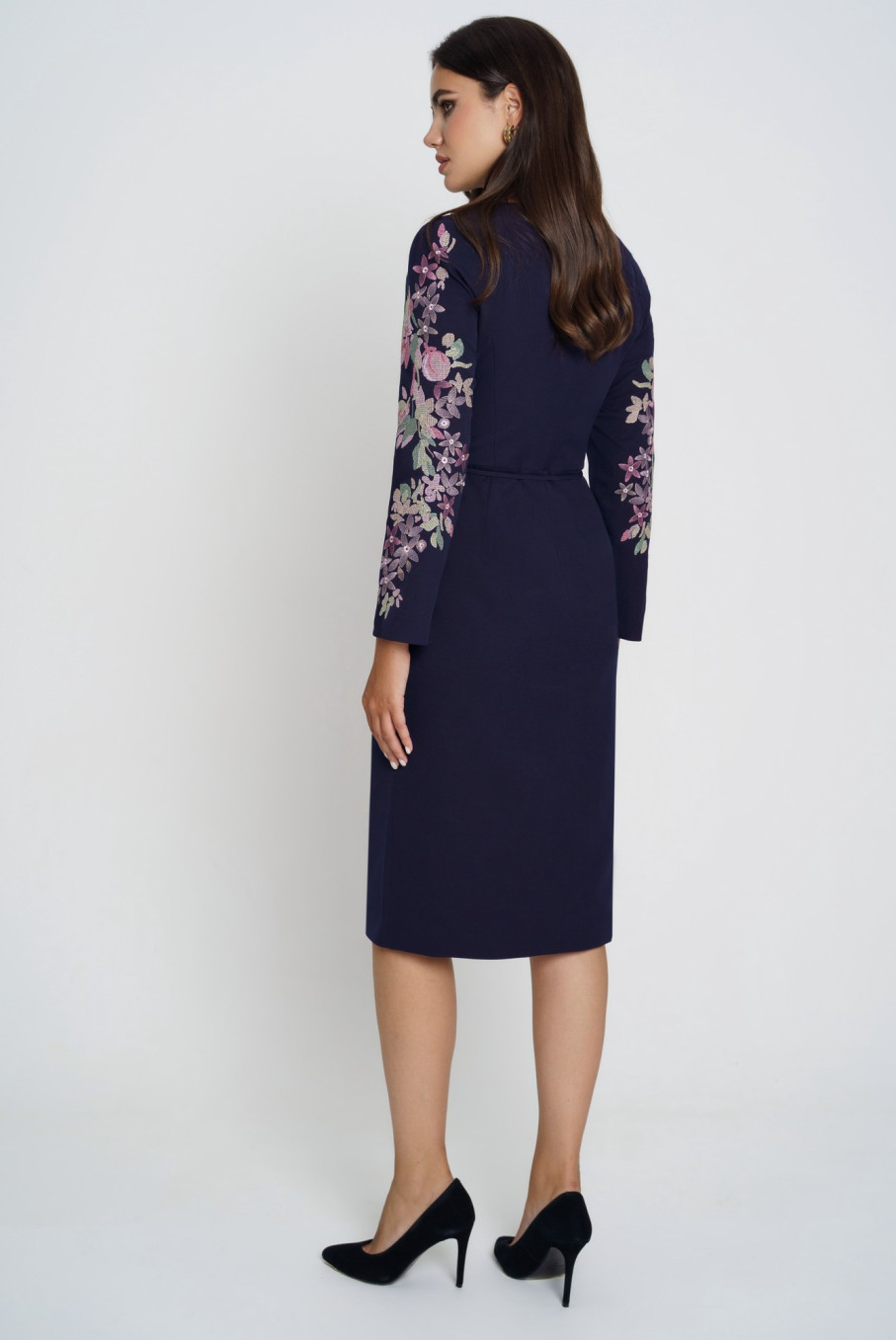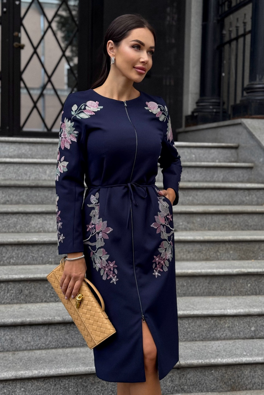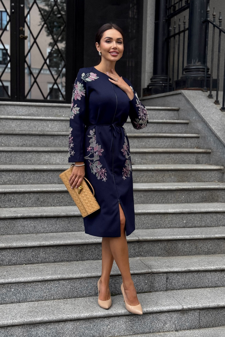 Плавные линии рисунка, благородный синий цвет и лаконичный крой создают образ, который хочется рассматривать. Это не просто платье с вышивкой женское, а модель с характером. Она смотрится интеллигентно, женственно и современно. Если вам близок офисный стиль женский pinterest, где есть вкус, мера и визуальная чистота, эта модель попадет точно в цель.