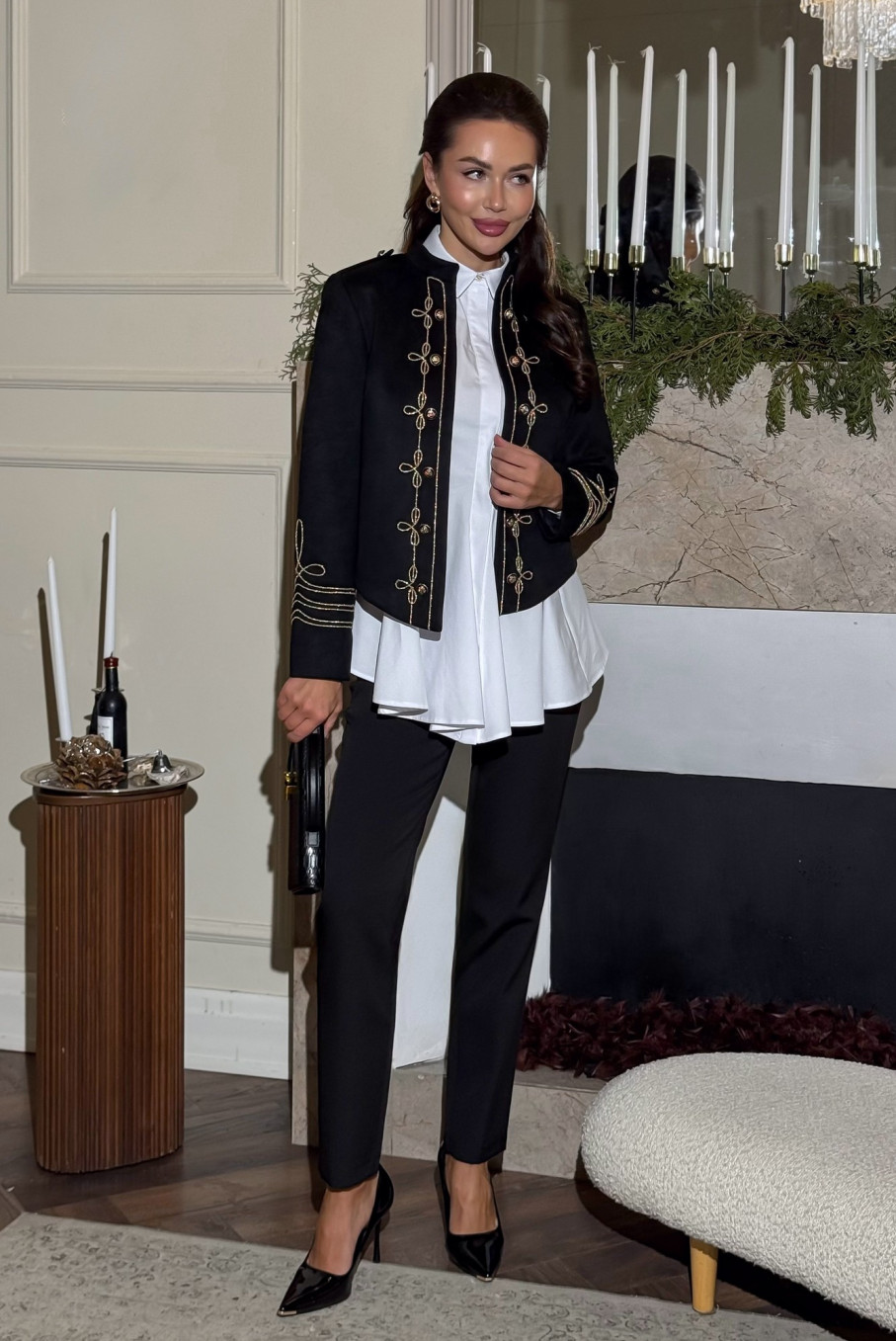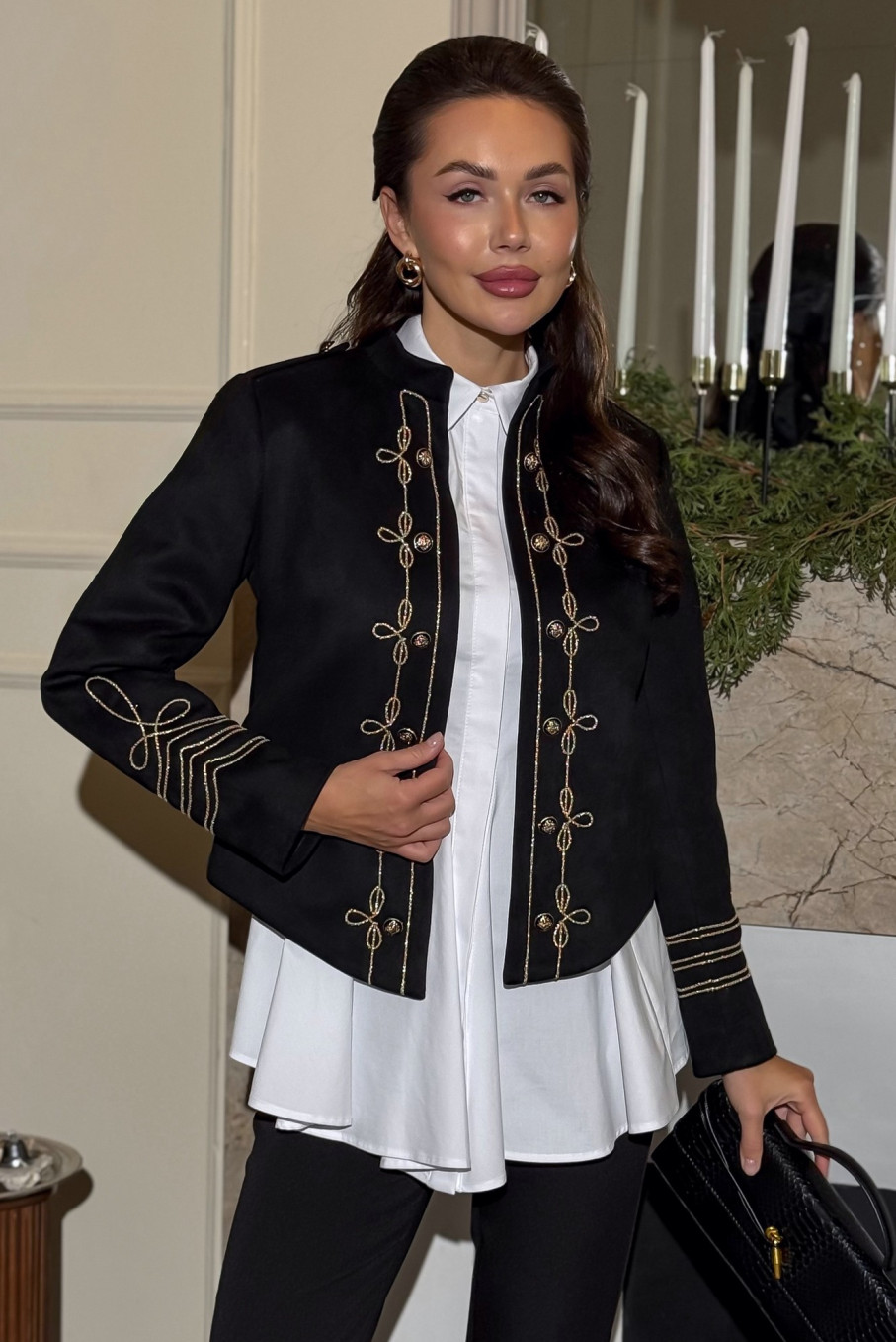 Этот чёрный нарядный жакет создан для женщин, ценящих внимание к деталям и гармонию между строгостью и изяществом. Вдохновлённый гусарским мундиром, жакет ЮРС стал олицетворением благородного стиля и женственности. Акцентная вышивка золотистыми нитями придаёт образу торжественность и лёгкий военный шарм, перекликаясь с мотивами стиля милитари для женщин, но в нарядном и утончённом исполнении.