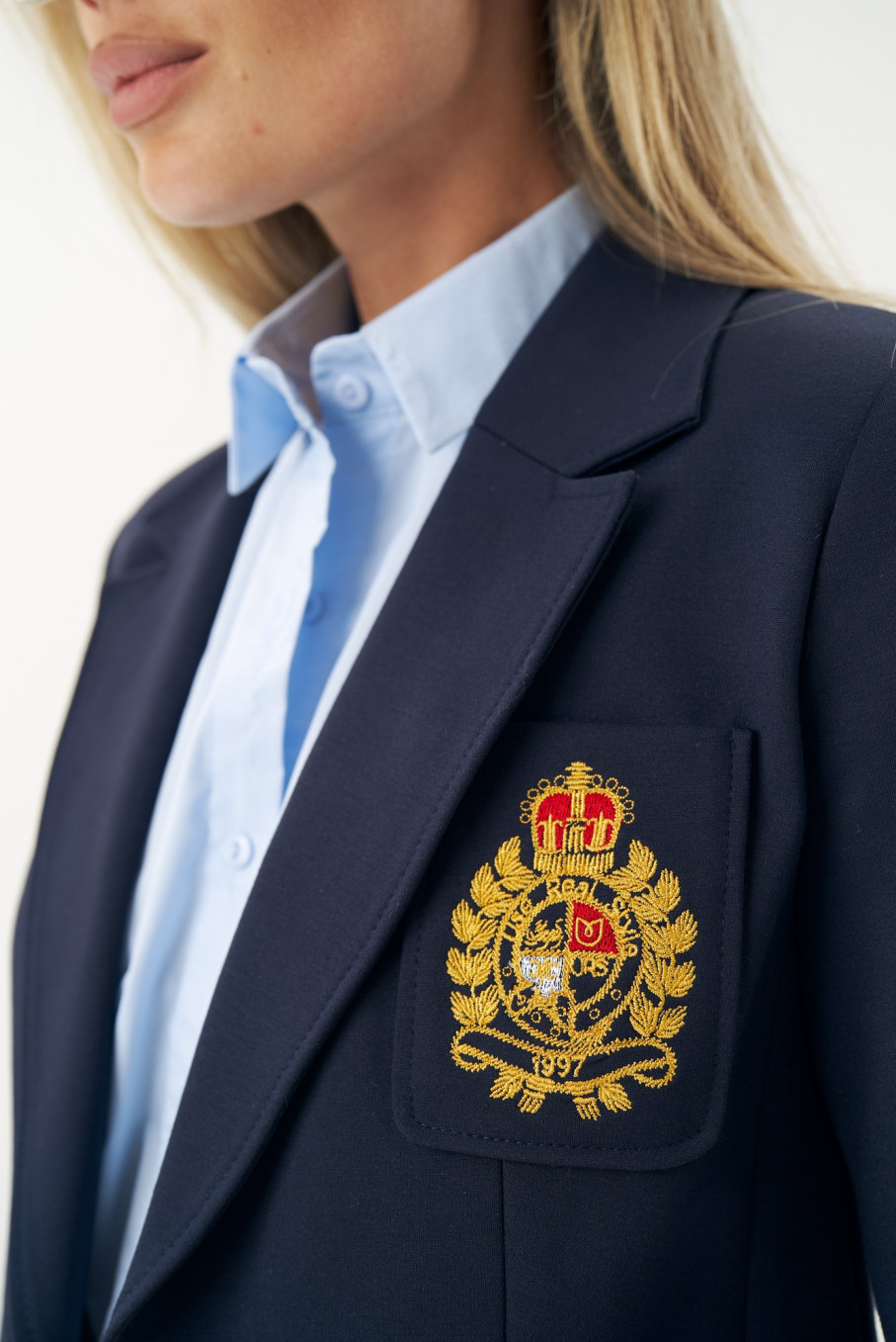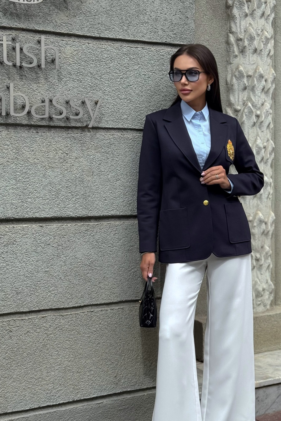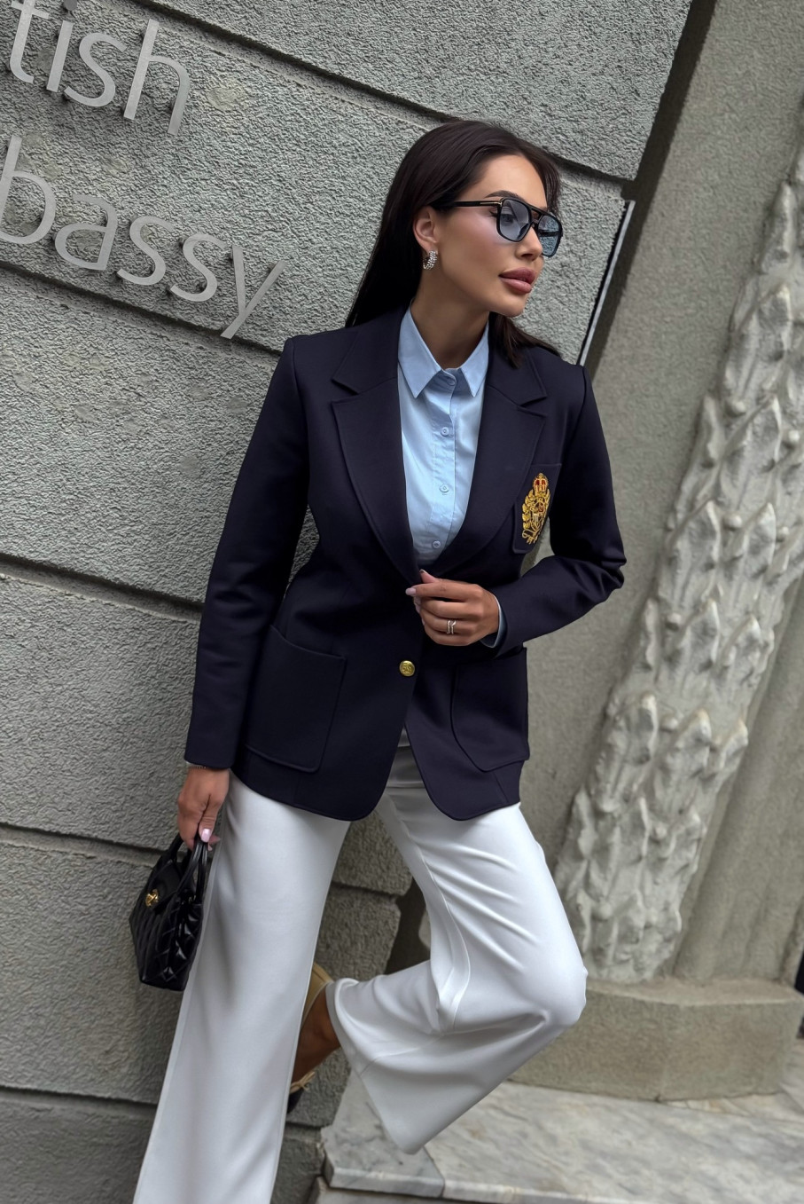 Главный акцент - вышивка в виде герба. Пиджак с вышивкой женский выглядит благородно и напоминает английский пиджак женский в лучших традициях классического гардероба. Контраст золотистой вышивки и глубокого синего оттенка создает выразительный, но не кричащий эффект.