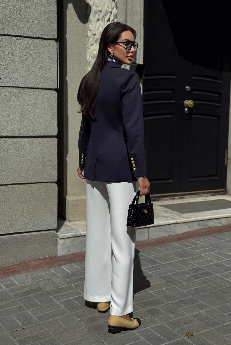 Золотистые пуговицы поддерживают тему аристократичной сдержанности. Жакет женский приталенный дополнен аккуратными лацканами и четкой линией плеча, что усиливает деловой стиль.