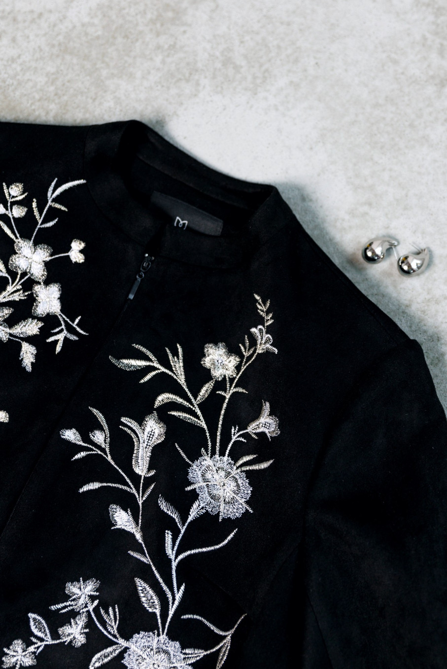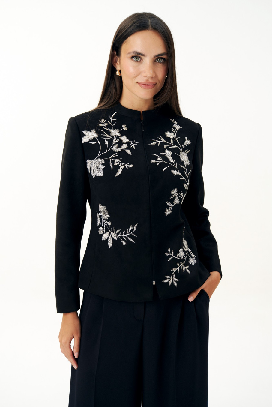 Женский нарядный жакет URS — это воплощение элегантности, уверенности и утончённого вкуса. Чёрный жакет с изысканной серебристой вышивкой станет центральным элементом вашего праздничного или вечернего образа. Лаконичный крой, идеальная посадка и благородная замшевая фактура делают его универсальным вариантом для особых случаев, официальных мероприятий и торжественных встреч.