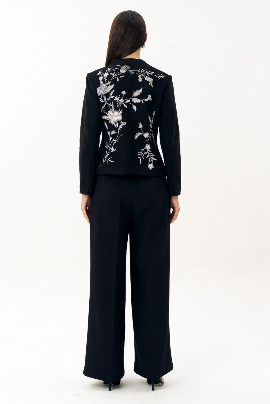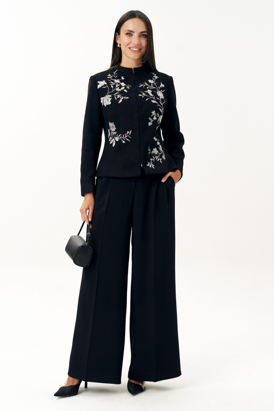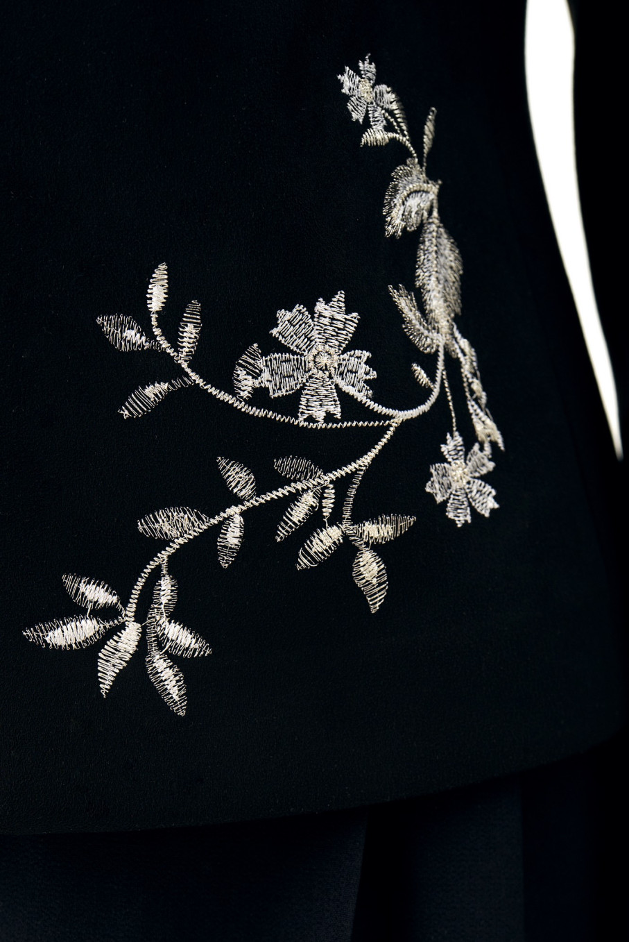 Этот чёрный нарядный жакет URS — не просто элемент гардероба, а символ женственности и внутренней силы. Вышивка ручной работы с цветочными мотивами придаёт пиджаку роскошное звучание, а чёткие линии силуэта подчёркивают фигуру. Он прекрасно сочетается как с классическими брюками, так и с юбкой-карандашом или длинной юбкой из струящейся ткани.