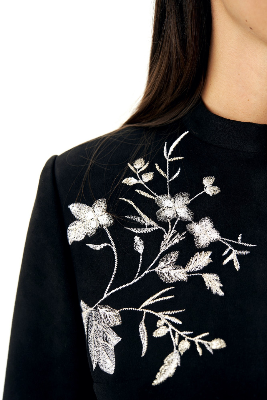 Для тех, кто предпочитает нарядную одежду для женщин вечернюю и в то же время ценит комфорт, жакет URS (ЮРС) предлагает идеальный баланс между стилем и удобством. Мягкий замшевый материал приятно ощущается на коже, а аккуратный воротник-стойка и потайная застёжка-молния подчёркивают современность дизайна. Вышивка серебристыми нитями красиво играет на свету, создавая эффект благородного свечения — идеальное решение для праздничной женской одежды.