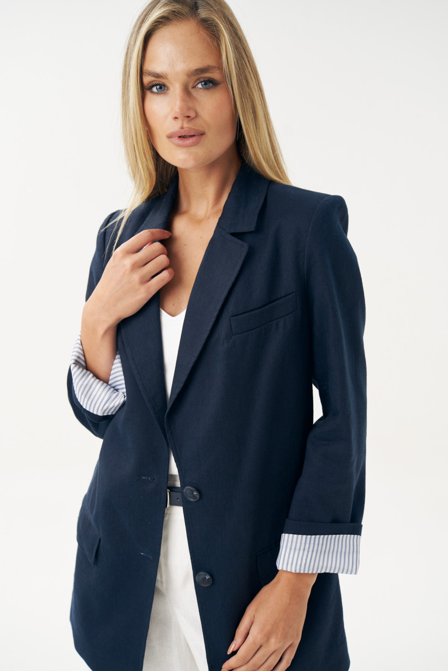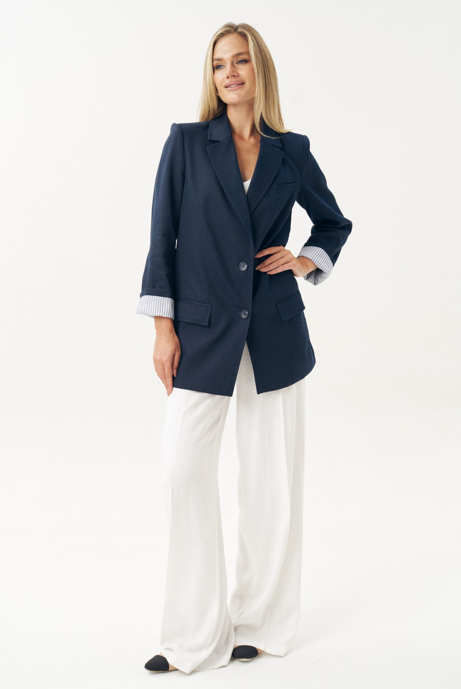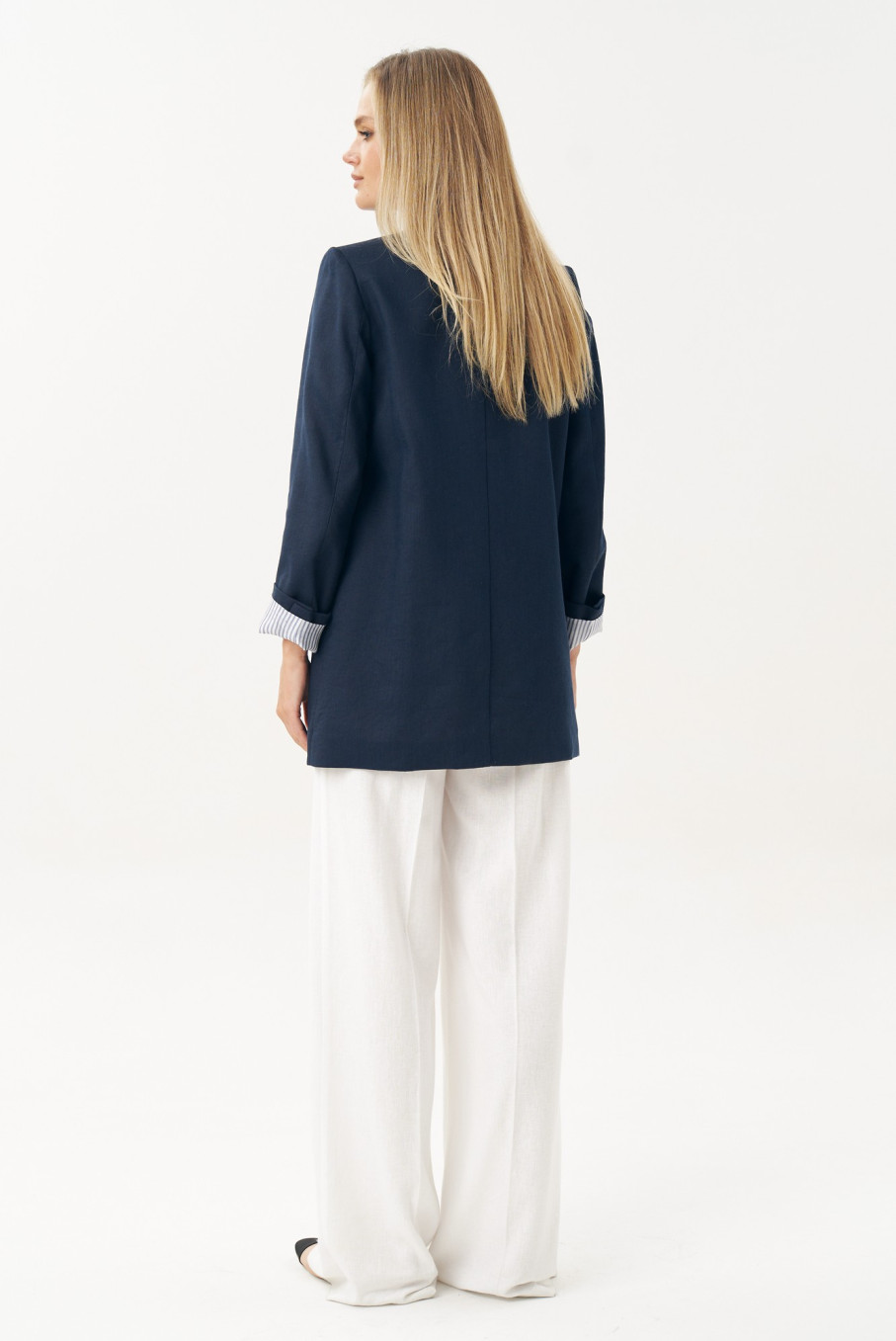 Офис и рабочие встречи: пиджак льняной женский синий поддерживает деловой стиль и выглядит корректно даже в строгом дресс-коде.