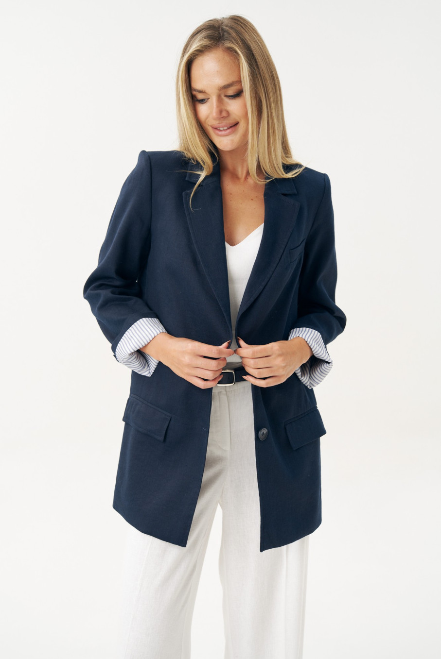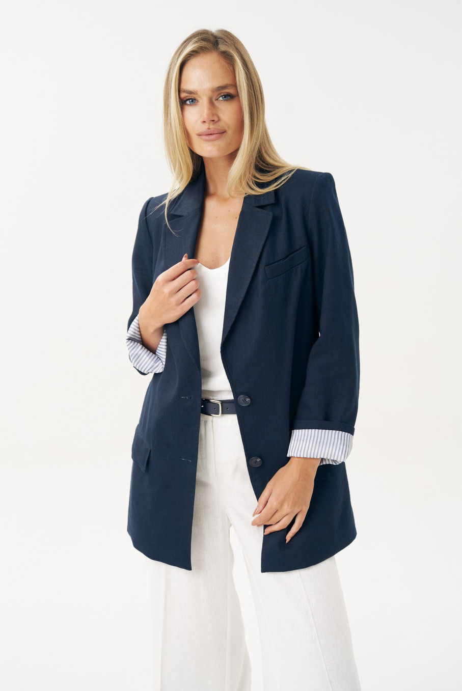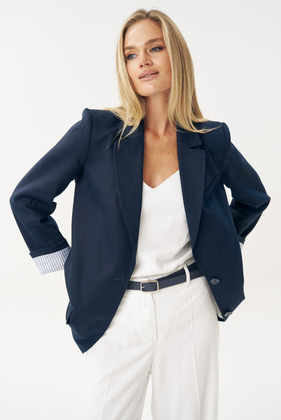 Офис и рабочие встречи: пиджак льняной женский синий поддерживает деловой стиль и выглядит корректно даже в строгом дресс-коде.