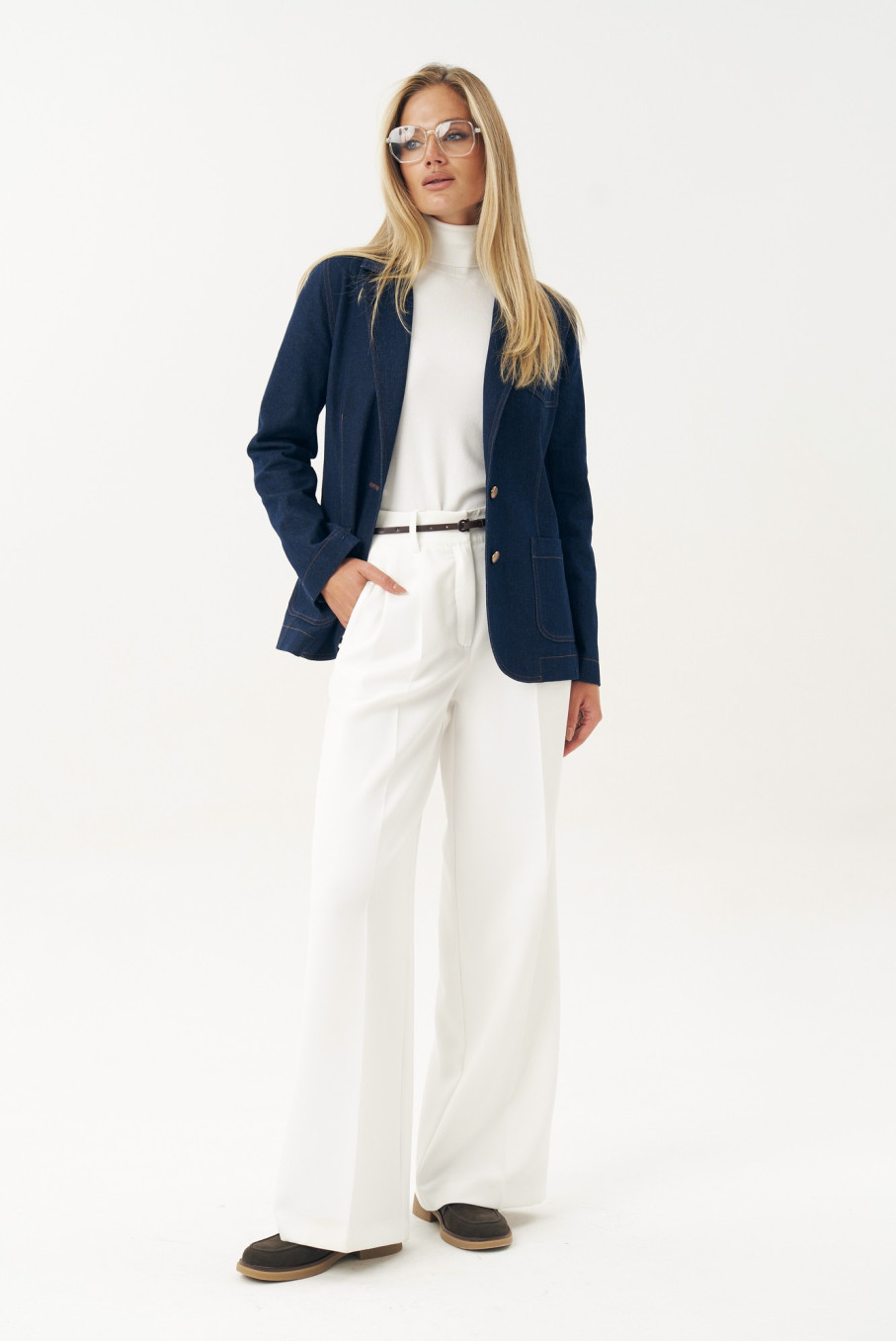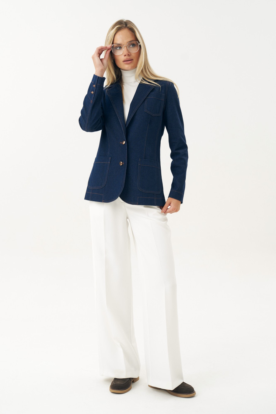 Пиджак женский синий особенно выигрышно смотрится в сочетании со светлыми брюками или водолазкой. Такой контраст делает образ чистым и структурным.