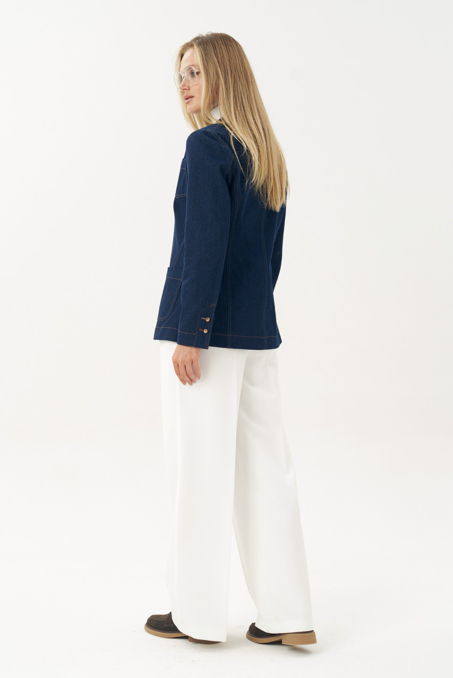 Джинсовый женский пиджак можно носить как пиджак женский под джинсы, создавая актуальный total denim. В то же время он гармонирует с классическими брюками - от молочных до бежевых оттенков.