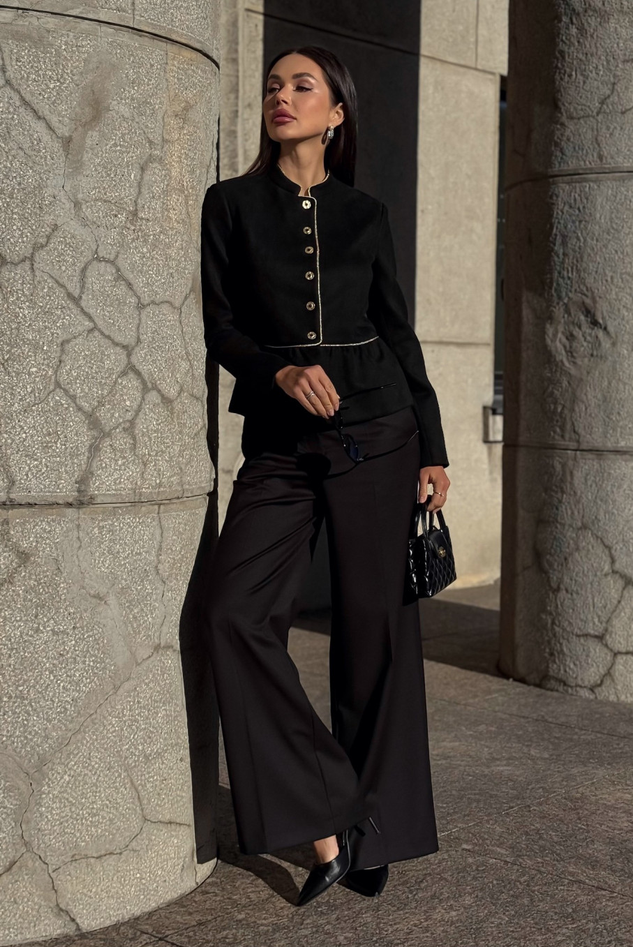 Особого внимания заслуживает стильная золотистая отделка вдоль планки и линии талии, которая придаёт жакету праздничный, но благородный акцент. В сочетании с декоративными пуговицами она напоминает пиджак в гусарском стиле — элегантный, выразительный и немного театральный.
