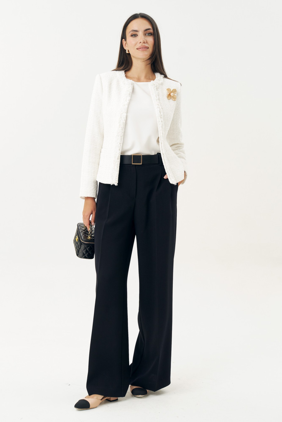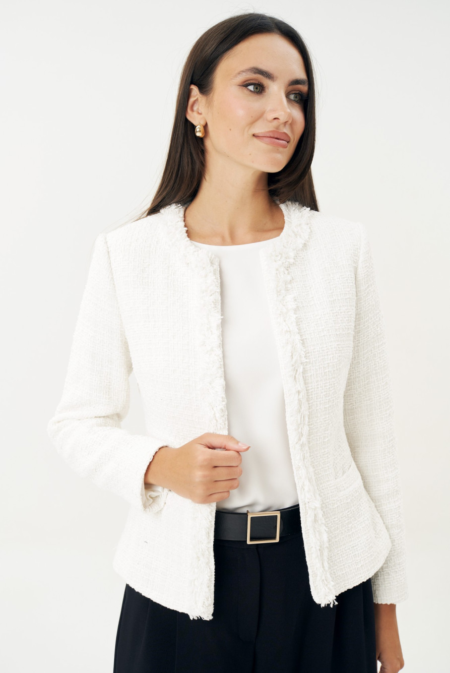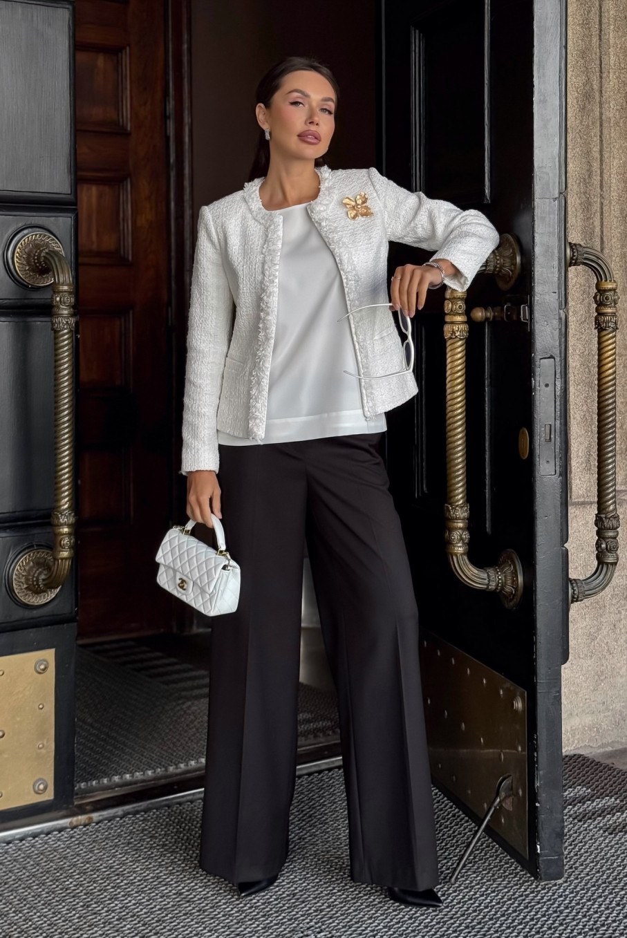 Твидовый жакет белый часто выбирают как альтернативу классическому чёрному пиджаку. Он выглядит мягче, светлее и современнее, сохраняя при этом строгость. Белый классический пиджак женский в твидовом исполнении легко адаптируется под разные стилистические задачи - от офисного дресс-кода до образов в эстетике олд мани.