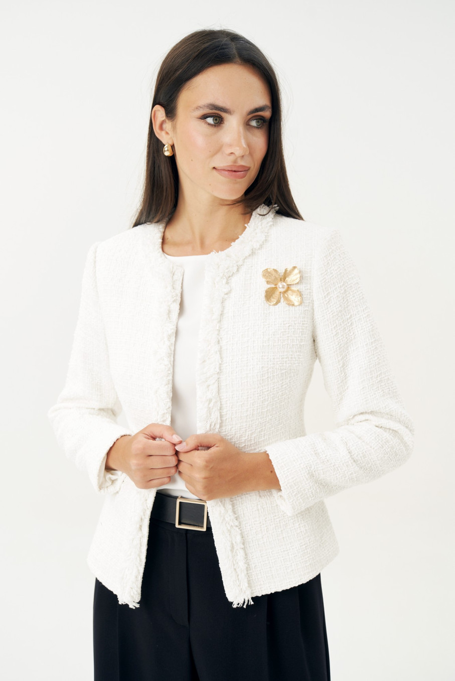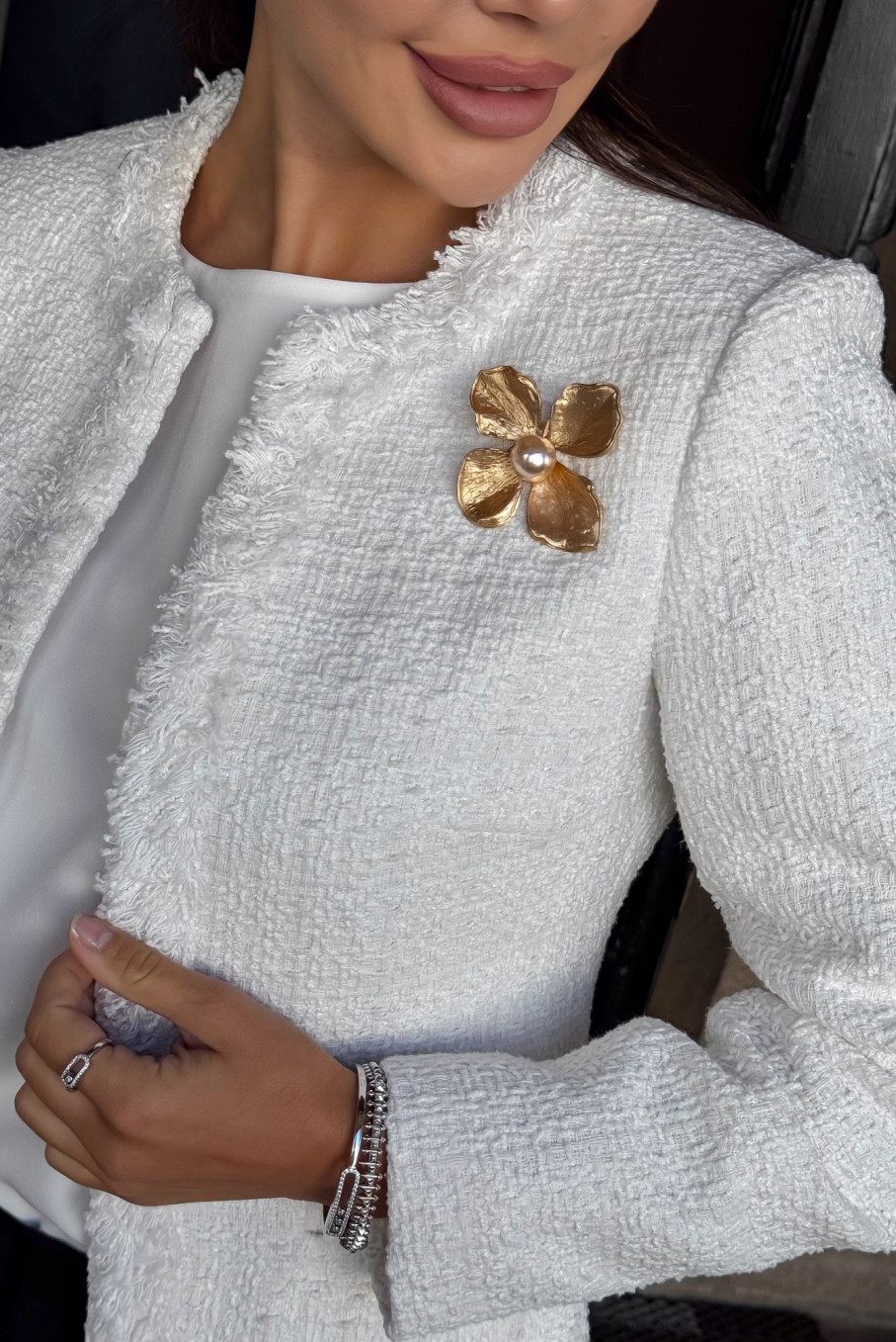 Данный твидовый жакет женский выполнен в классическом стиле: лаконичный крой, аккуратная линия плеч, ровный борт без перегруженных деталей. Декоративная дизайнерская брошь служит акцентом, который придаёт образу индивидуальность и завершённость. При желании брошь можно снять, превратив жакет в универсальный базовый пиджак женский белый.