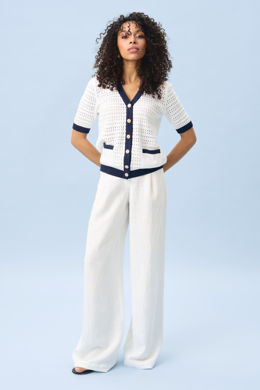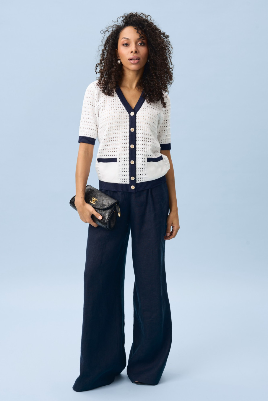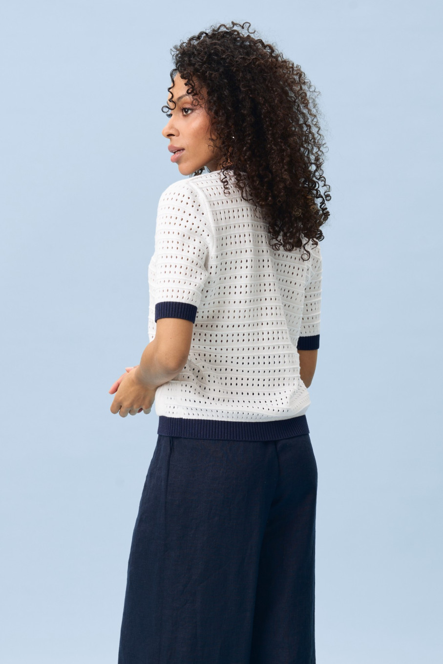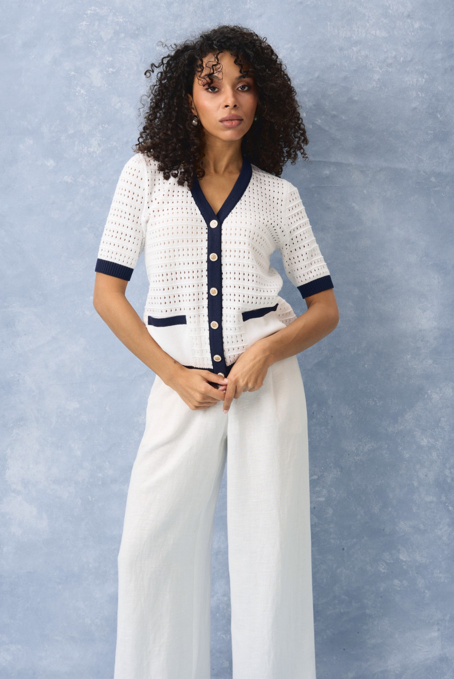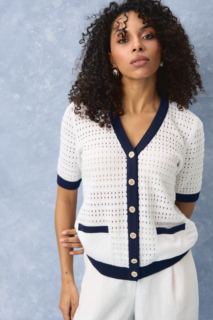 По ощущениям это тонкий джемпер женский, который не перегружает образ. Он может выступать как самостоятельная кофточка женская с коротким рукавом или как кардиган в морском стиле женский, если носить его расстегнутым поверх топа.