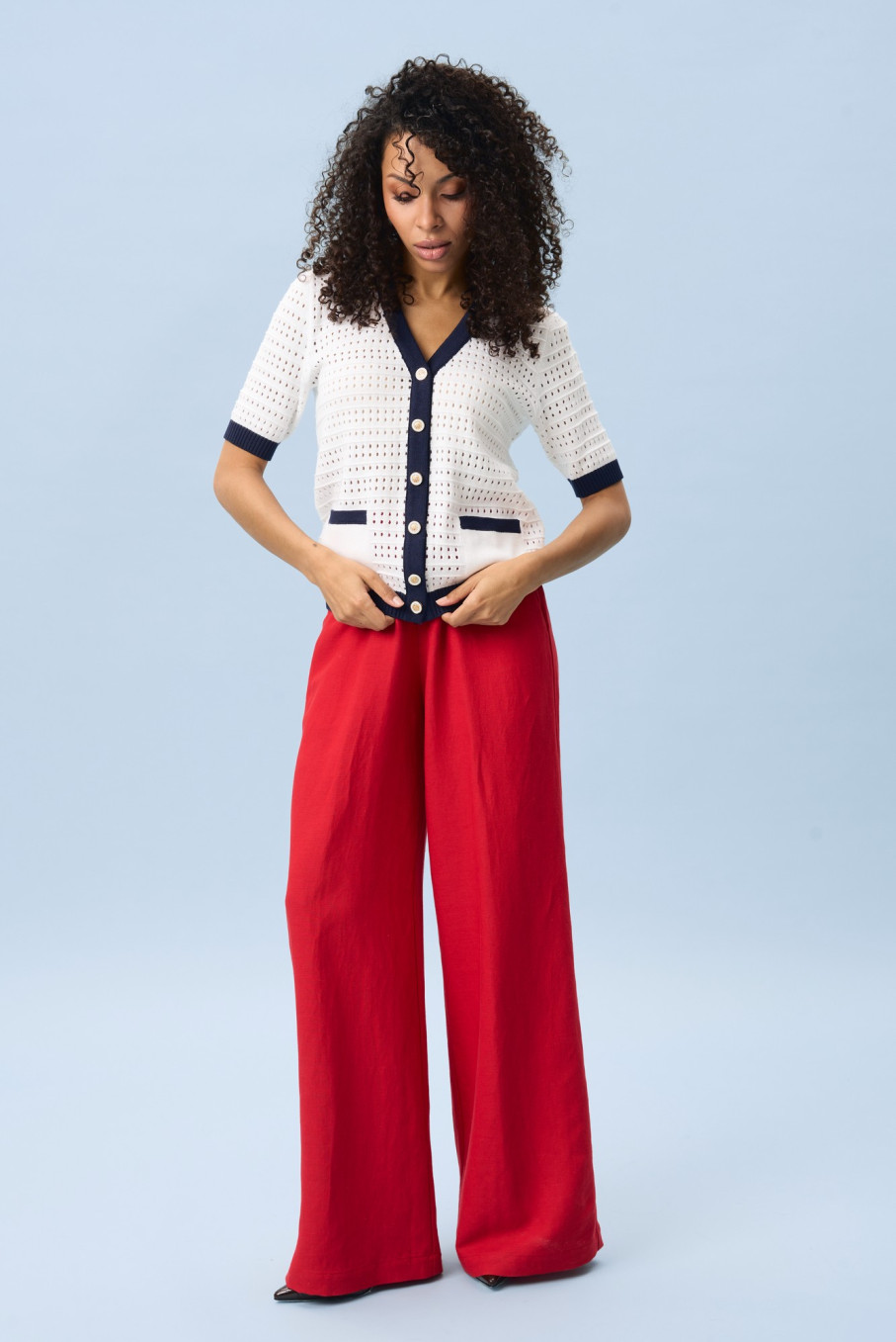 с яркими брюками для акцентного образа
